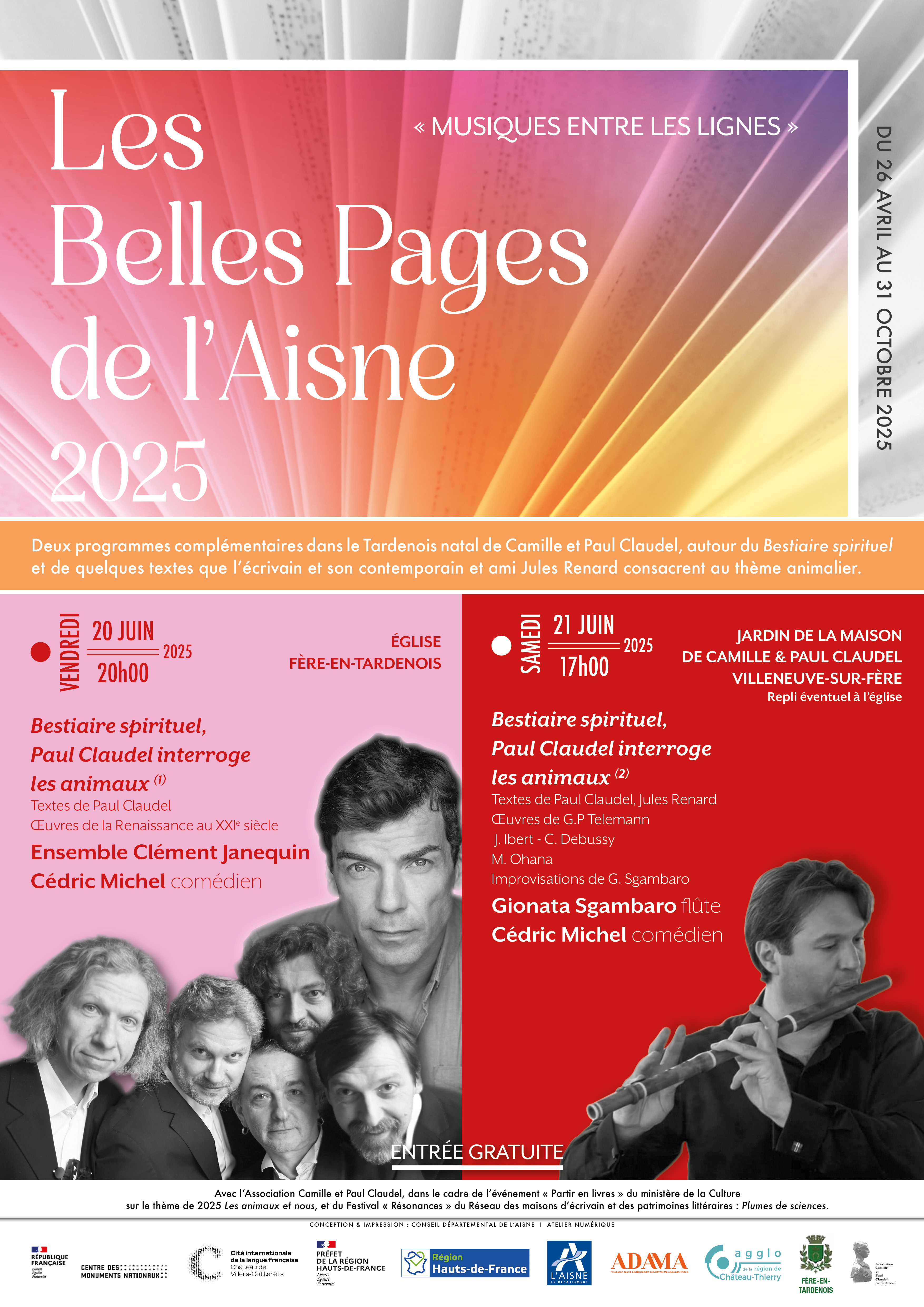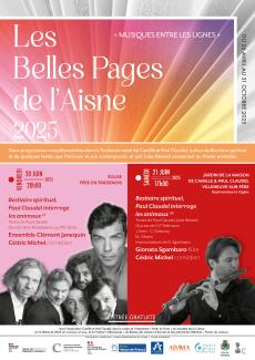« Les Belles Pages de l'Aisne » offrent chaque année depuis 2000, à l'initiative de l'ADAMA (Association pour le Développement des Activités Musicales dans l’Aisne), une programmation d’événements qui s’inspirent des grands auteurs liés au territoire axonais. De Racine à Paul Claudel, de La Fontaine à Alexandre Dumas, concerts instrumentaux et vocaux, lectures et déclamations animent des projets dédiés à leurs œuvres ou leurs époques, entre répertoire et création.