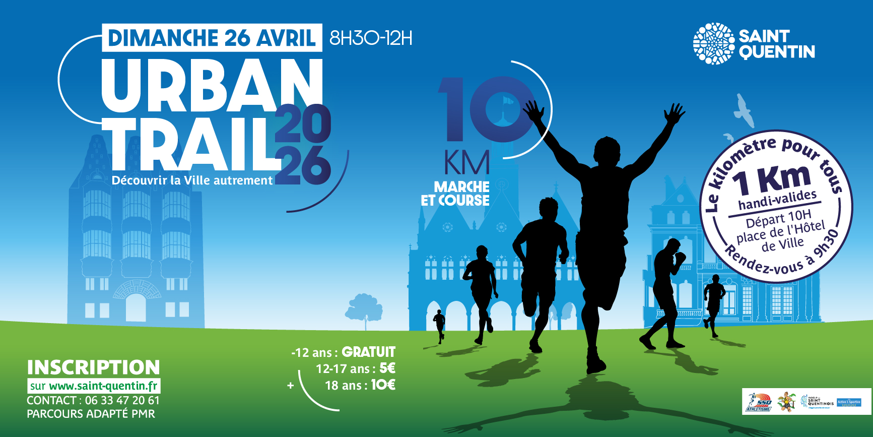 Envie de découvrir la ville autrement à travers les lieux emblématiques de la ville ? Rejoignez-nous pour un Urban Trail, en marche ou en course, dans une ambiance conviviale en famille, entre amis ou en solo ! Rendez-vous le dimanche 26 avril 2026 à partir de 9h30 (départ à 10h) Place de l’Hôtel de Ville. Inscriptions ouvertes dès maintenant sur HelloAsso. Infos : 06 33 47 20 61 Tarifs : - moins de 12 ans : Gratuit - 12–17 ans : 5 € - adulte : 10 € - le kilomètre pour tous (1 km) : à partir de 2€ (ous les bénéfices seront reversés à une association afin d'organiser une journée de sensibilisation au handicap ou à la découverte de la pratique handisport) Que vous soyez sportif, marcheur du dimanche ou simplement curieux, cet événement est fait pour vous. Partagez et venez nombreux ! A très vite, le compte à rebours est lancé ! https://youtube.com/shorts/R5XjCwdUJeM Coorganisé par la Ville de Saint-Quentin, l'ACPI et le Stade Saint-Quentinois.