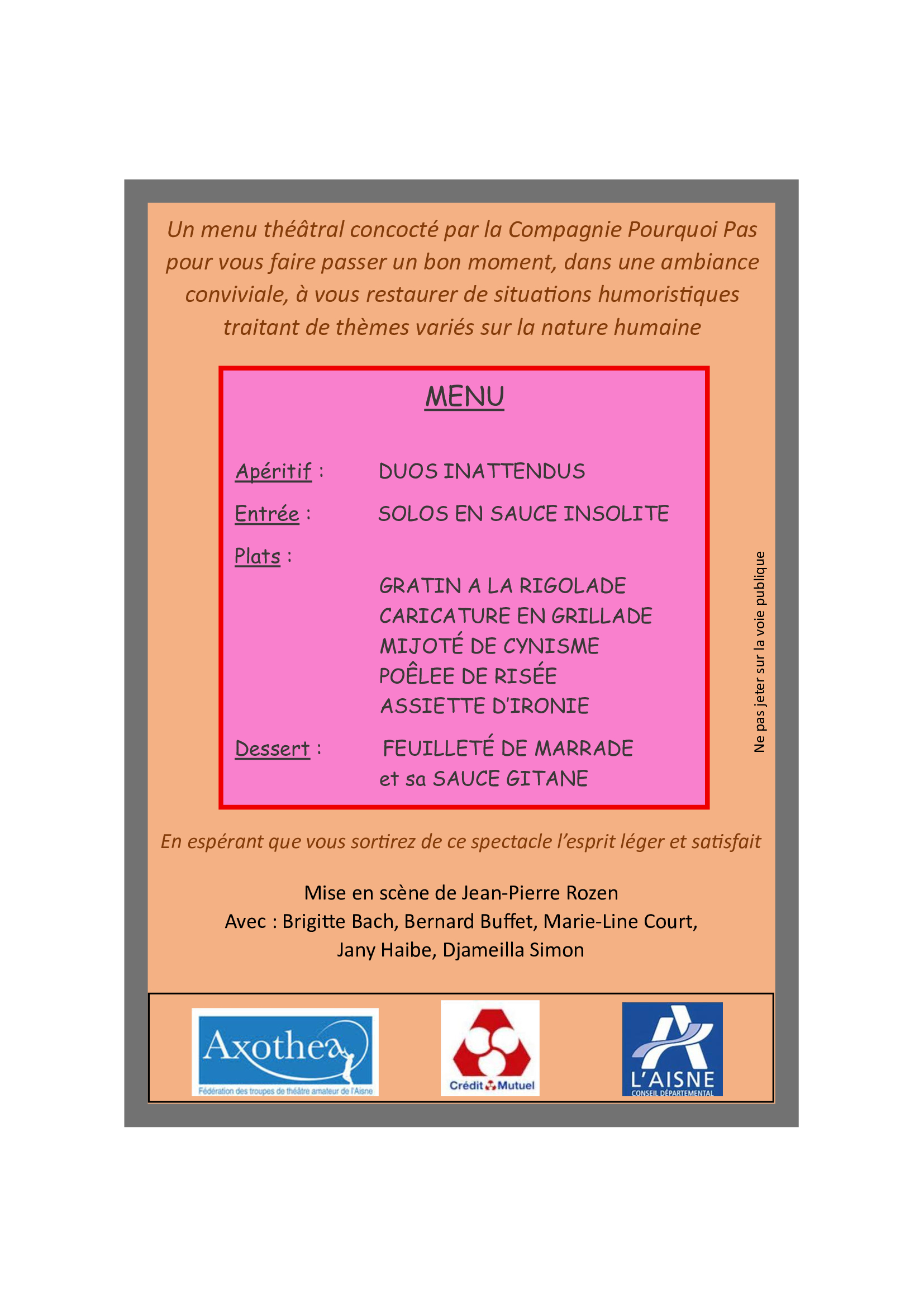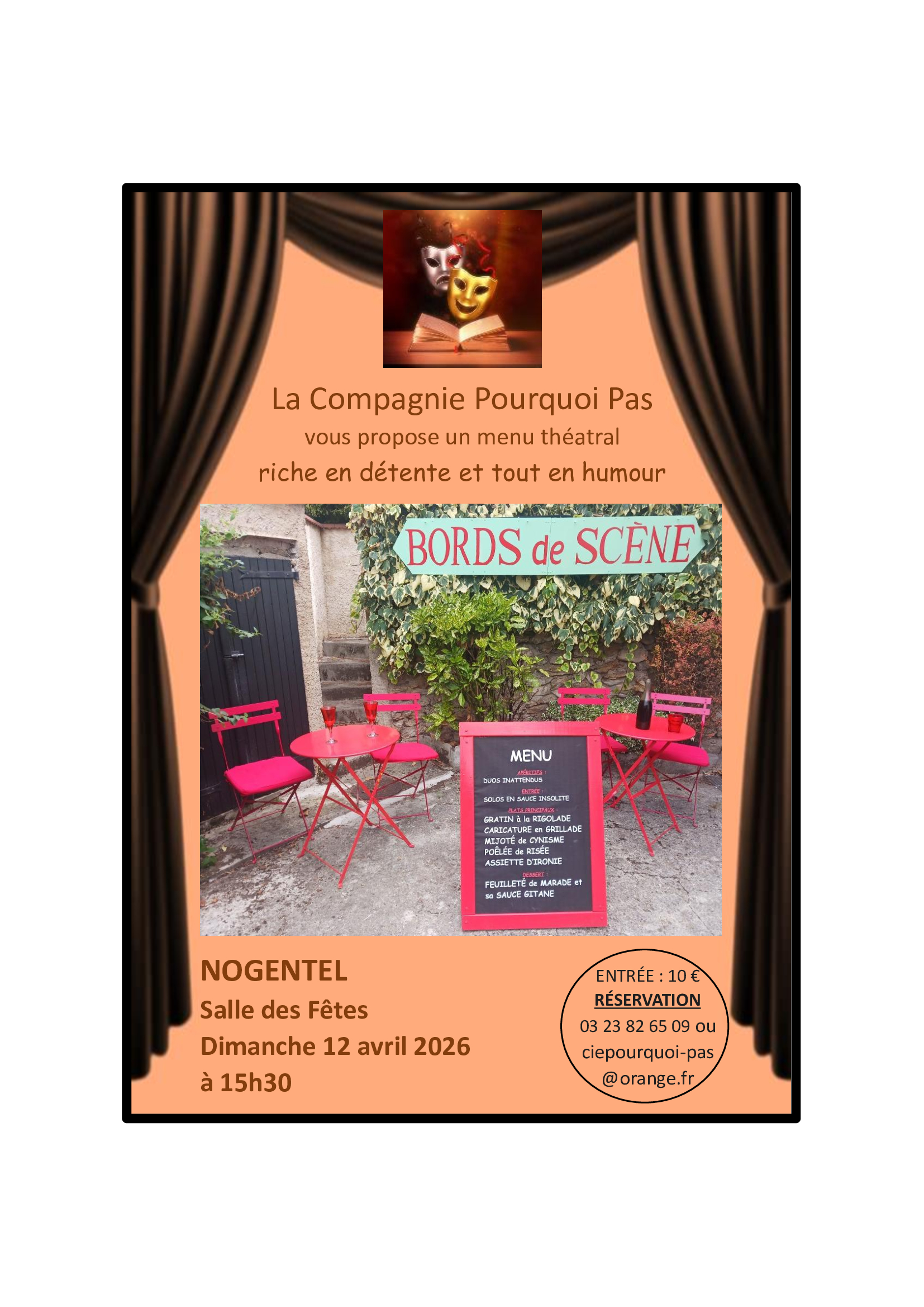 La Compagnie Pourquoi Pas vous propose un après-midi théâtral à vous restaurer de situations humoristiques autour d'un menu léger d'esprit et riche en détente le dimanche 12 Avril à Nogentel Un menu théâtral concocté par la Compagnie Pourquoi Pas pour vous faire passer un bon moment, dans une ambiance conviviale, traitant de thèmes variés sur la nature humaine Entrée 10 € , sur réservation