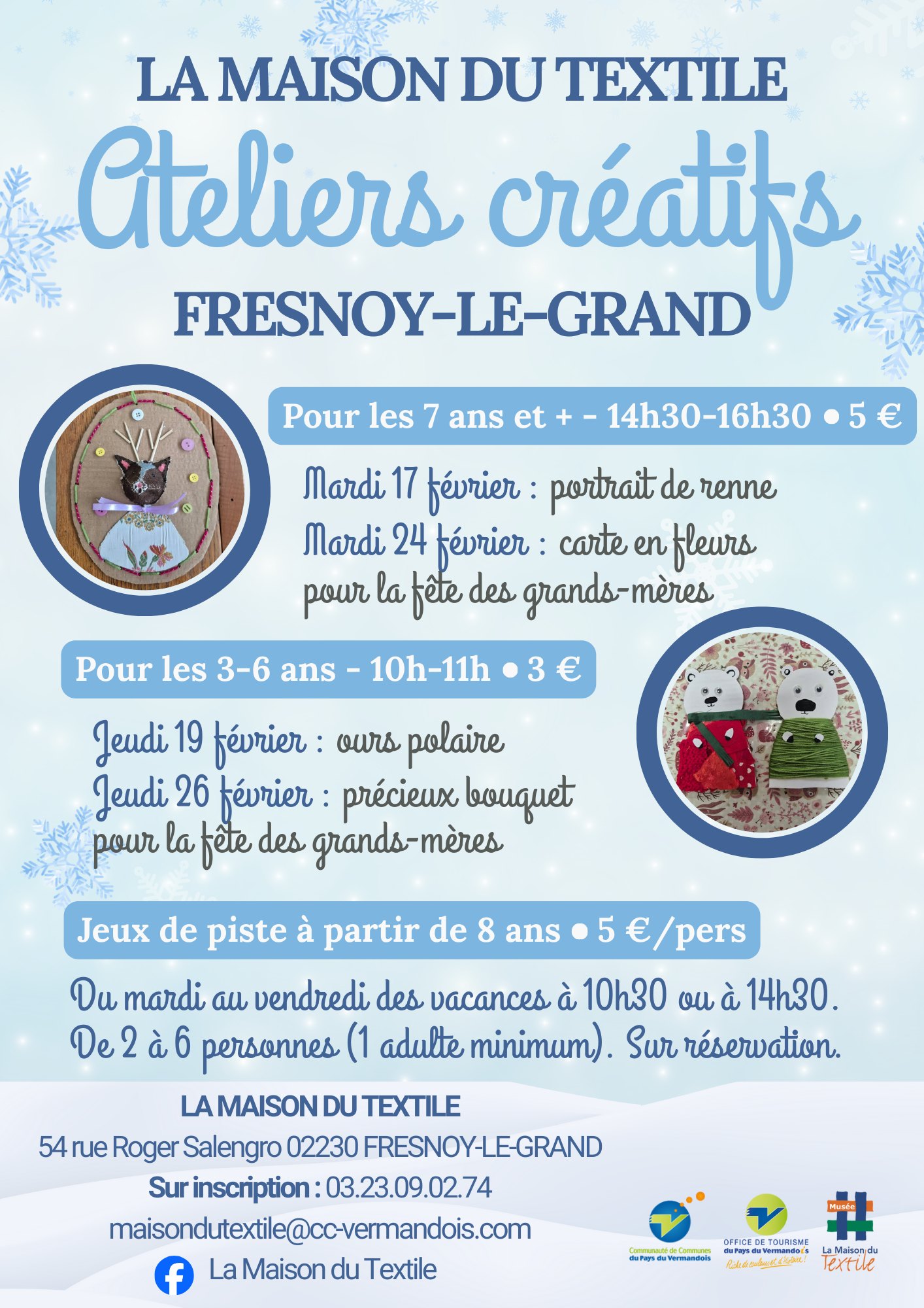 La Maison du Textile propose des ateliers créatifs pour les 3-6 ans et les enfants à partir de 6 ans en février 2026. Pour les 7 ans et +, de 14h30 à 16h30 Tarif 5 € - Mardi 17 février : portrait de renne - Mardi 24 février : carte en fleurs pour la fête des grands-mères Pour les 3-6 ans, de 10h à 11h Tarif 3 € - Jeudi 19 février : ours polaire - COMPLET - Jeudi 26 février : précieux bouquet pour la fête des grands-mères - COMPLET Ateliers et jeux de piste sur réservation au 03.23.09.02.74 ou à maisondutextile@cc-vermandois.com.