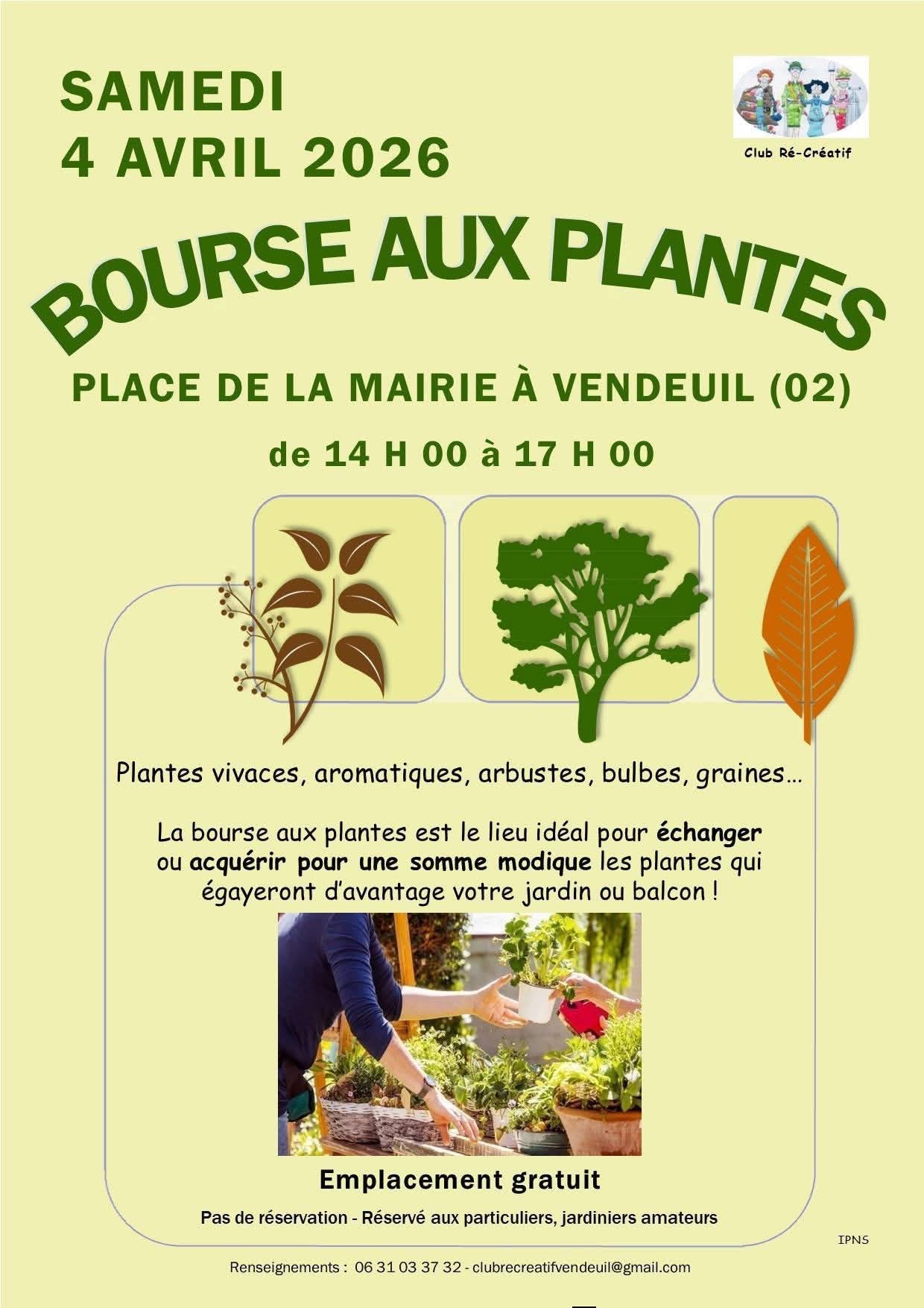 Rendez-vous à Vendeuil (place de la mairie) le samedi 4 avril 2026 de 14h à 17h, pour la bourse aux plantes organisée par le Club Ré-Créatif et réservée aux particuliers. - Vente de surplus du jardin par des jardiniers amateurs : plantes vivaces, fleurs, arbustes, grimpantes, petits fruitiers, boutures, bulbes, magazines, pots, petits outils... - Échanges de graines avec la Grainothèque. - Emplacement gratuit, sans réservation. Renseignements : 0631033732 clubrecreatifvendeuil@gmail.com