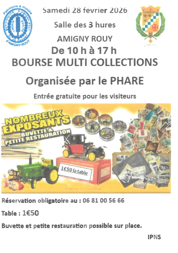 Bourse multi collections à Amigny-Rouy le samedi 28 février de 10h à 17h salle des 3 hures organisée par le PHARE. Buvette et petite restauration sur place. 1.50€ la table. Réservation obligatoire au 06 81 00 56 66.