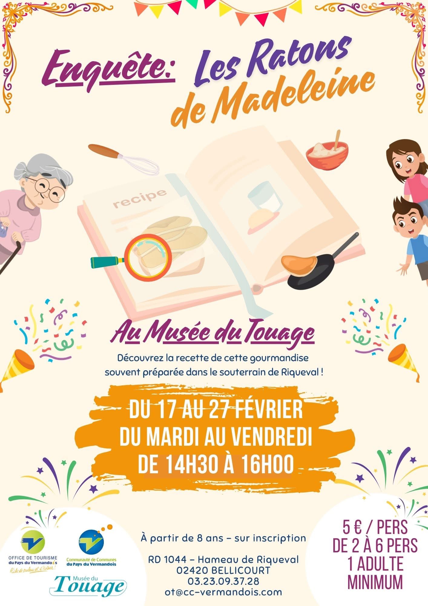 Pour les vacances scolaires de février, le Musée du touage à Bellicourt vous propose de mener l'enquête et de découvrir la recette des ratons de Madeleine, une gourmandise souvent préparée dans le souterrain de Riqueval. Jeu disponible du 17 au 27 février 2026 du mardi au vendredi de 14h30 à 16h A partir de 8 ans et sur inscription au 0323093728 Tarif : 5€ par personne de 2 à 6 personnes avec au minimum 1 adulte.