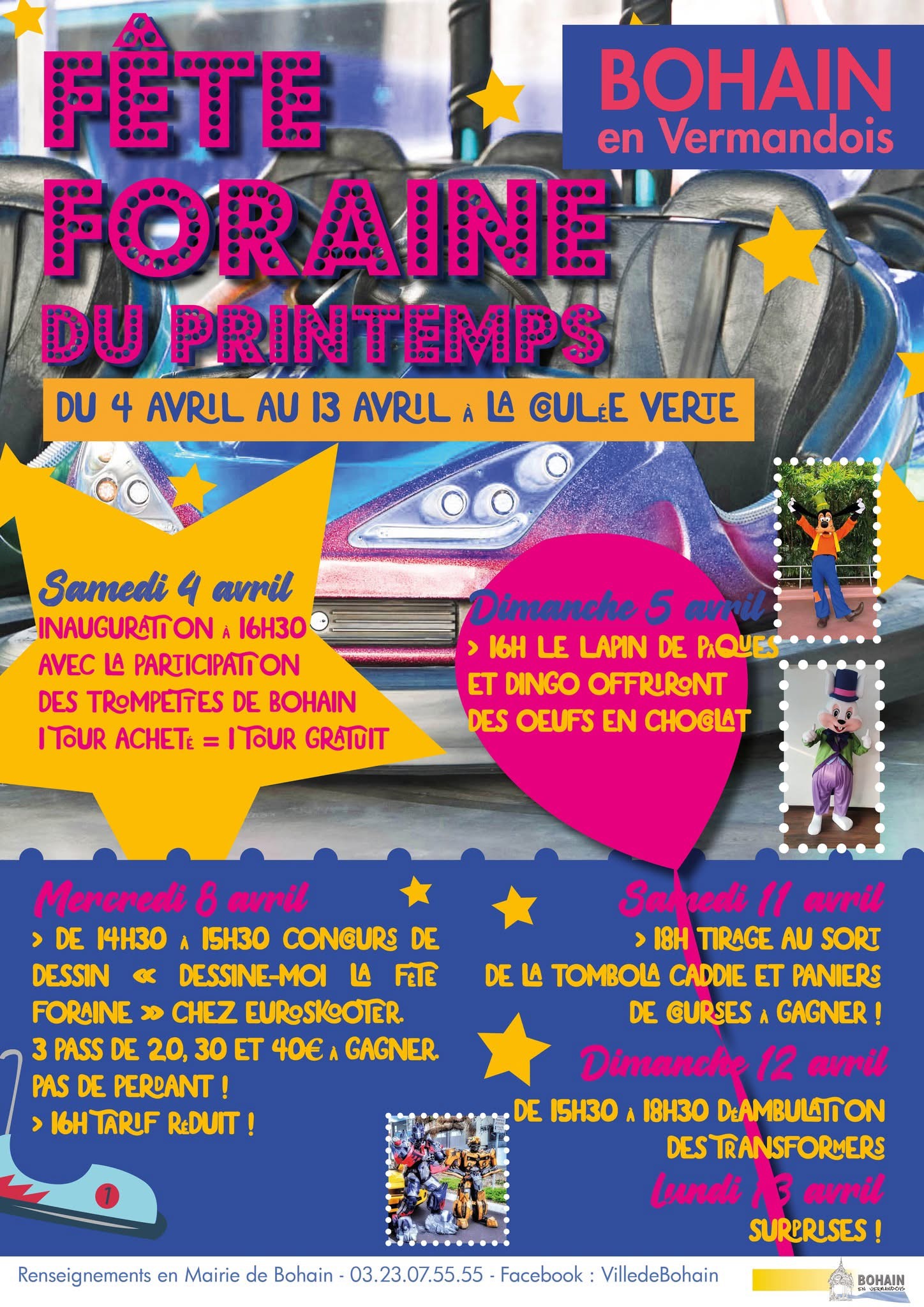 La fête foraine de Printemps à Bohain-en-Vermandois prendra place à la coulée verte du 4 au 13 avril ! L'inauguration est prévue pour 16h30 avec la participation des trompettes de Bohain ! Renseignements en mairie de Bohain : 03 23 07 55 55