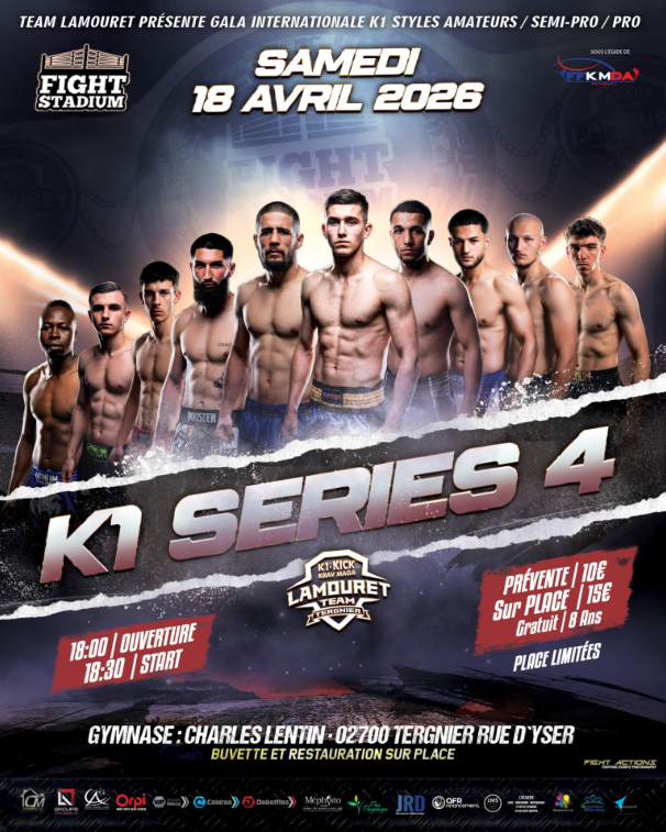 Fight stadium K1 Series 4 à Tergnier le samedi 18 avril à 18h au Gymnase Charles Lentin. Ouverture à 18h et début à 18h30. Restauration et buvette sur place. Tarifs: Prévente 10€. Sur place, 15€. Gratuit jusqu'à 8 ans. Place limitées.