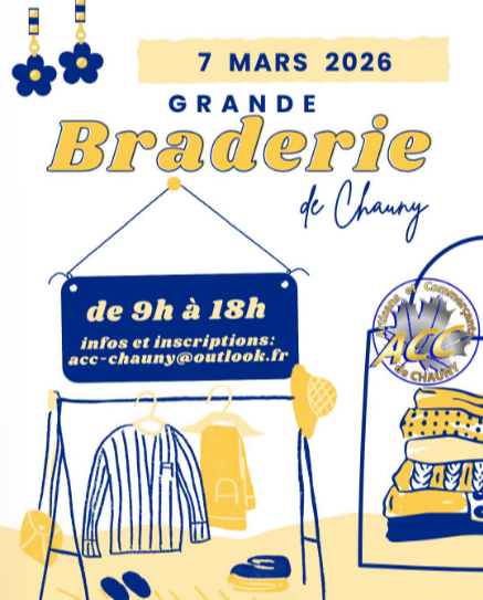 La grande braderie de Chauny se déroulera le Samedi 7 mars 2026 de 9h à 18h. Informations et inscriptions : acc-chauny@outlook.fr