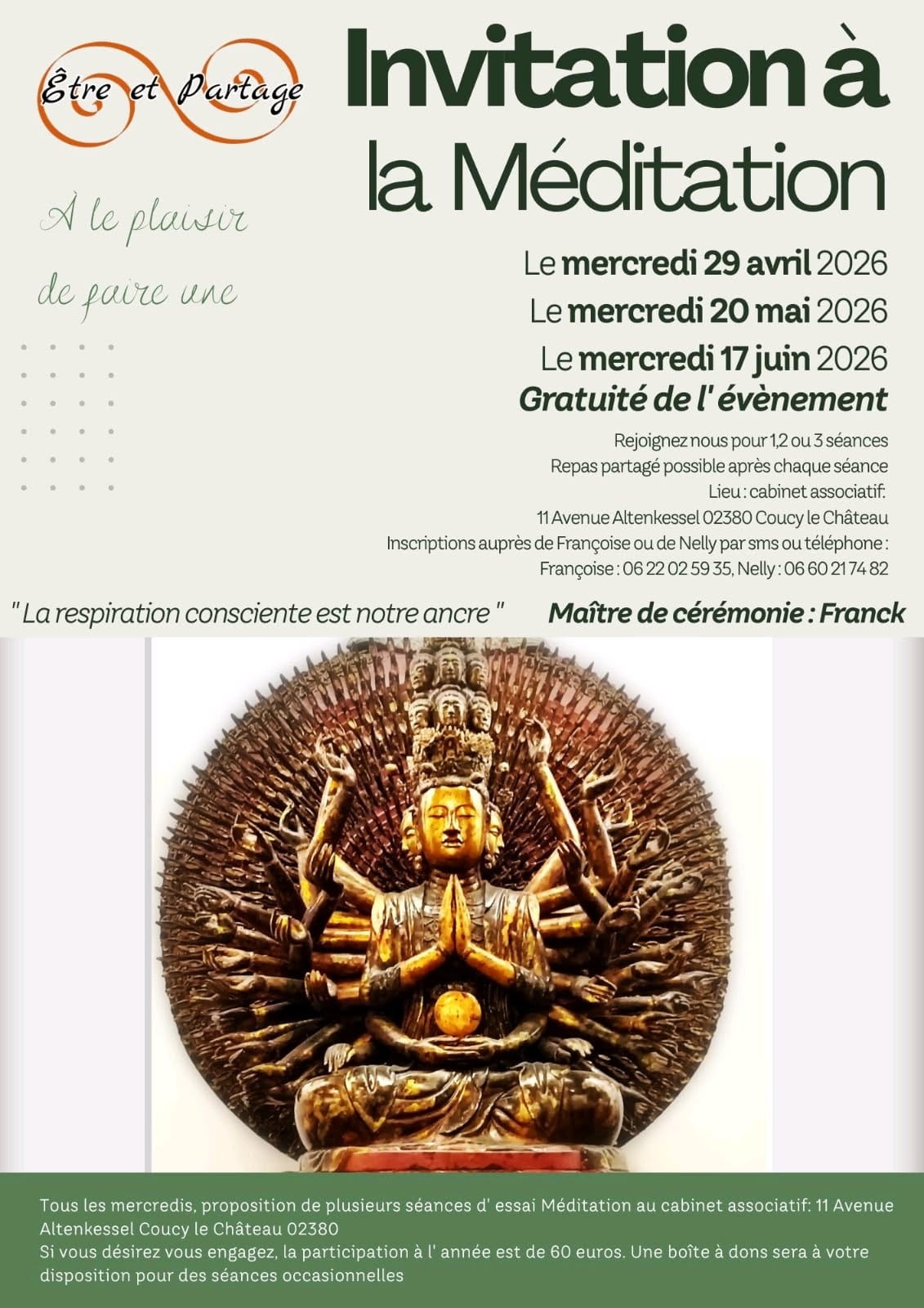 Rendez-vous le mercredi 29 Avril, 20 Mai, 17 Juin 2026. Repas partagée possible pour chaque fin de séances. Gratuité de l'événement. Maitre de cérémonie : Franck