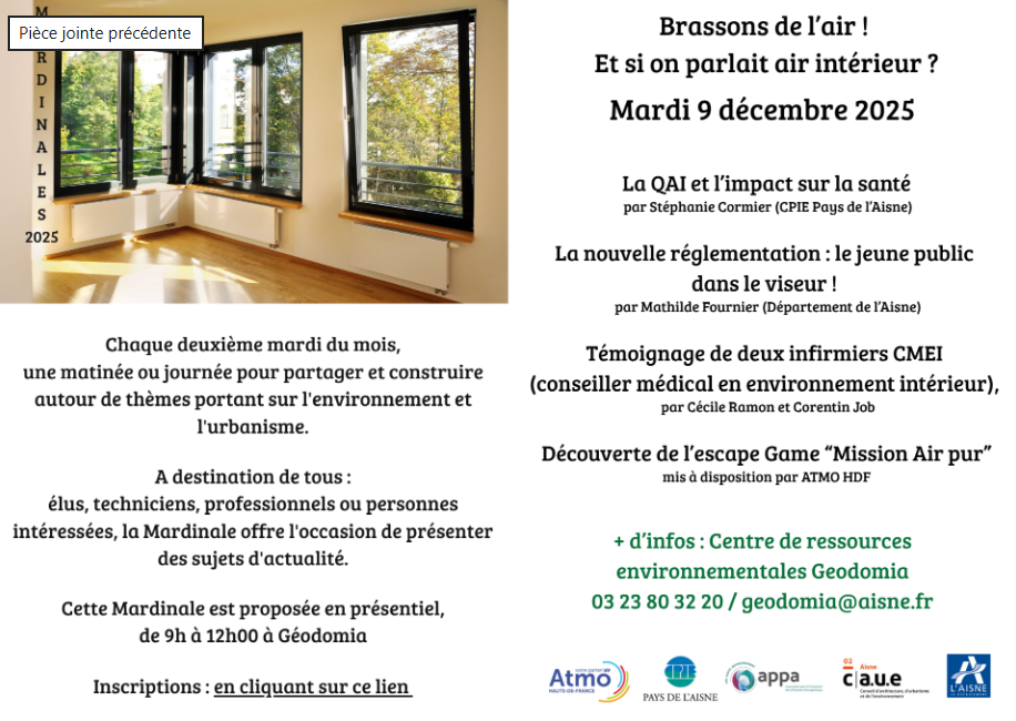 Rendez vous le mardi 9 décembre 2025 au centre de ressources environnementales Géodomia à Merlieux-et-Fouquerolles de 9h à 12h30 pour une mardinale sur la qualité de l'air intérieur. Au programme : Conférence sur La QAI et l'impact sur la santé Conférence sur la nouvelle réglementation : le jeune public dans le viseur Témoignage de deux infirmiers CMEI Découverte de l'escape Game "Mission Air Pur". Inscritpions : https://forms.office.com/e/GZnQ8P2ZrE Infos: Geodomia 03 23 80 32 20 / geodomia@aisne.fr