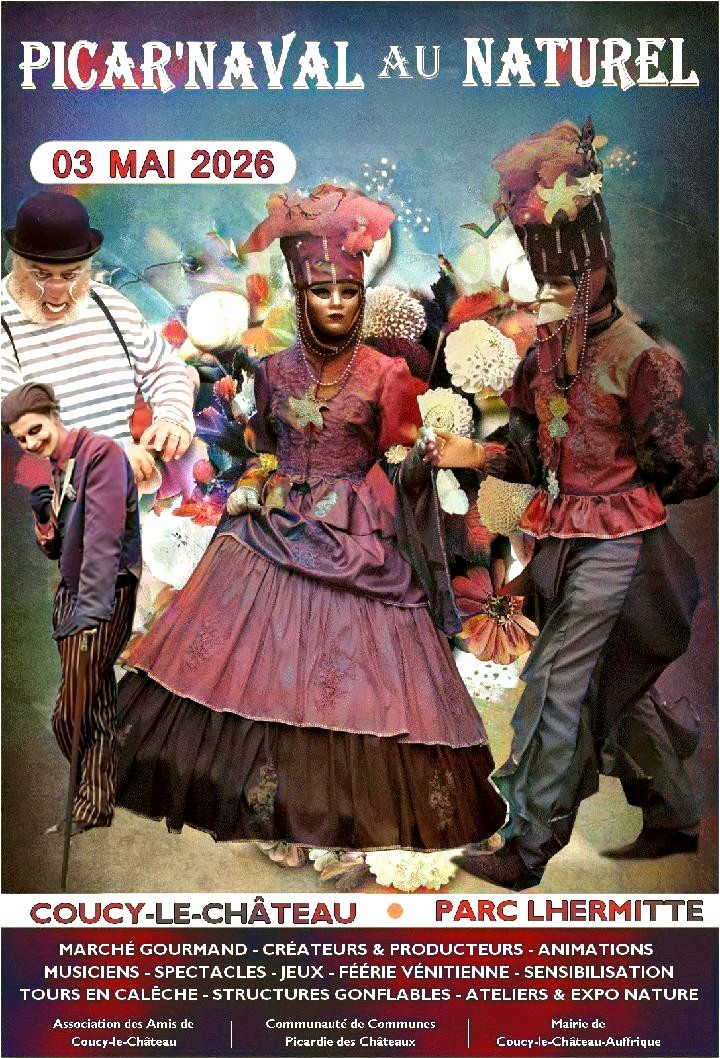 Rendez-vous le dimanche 3 mai 2026 pour assister au picar'naval de Coucy le chateau dans le parc lhermitte. Au programme de la journée : marché gourmand, animations musiciens, jeux, tours en calèche, atelier expo nature ...