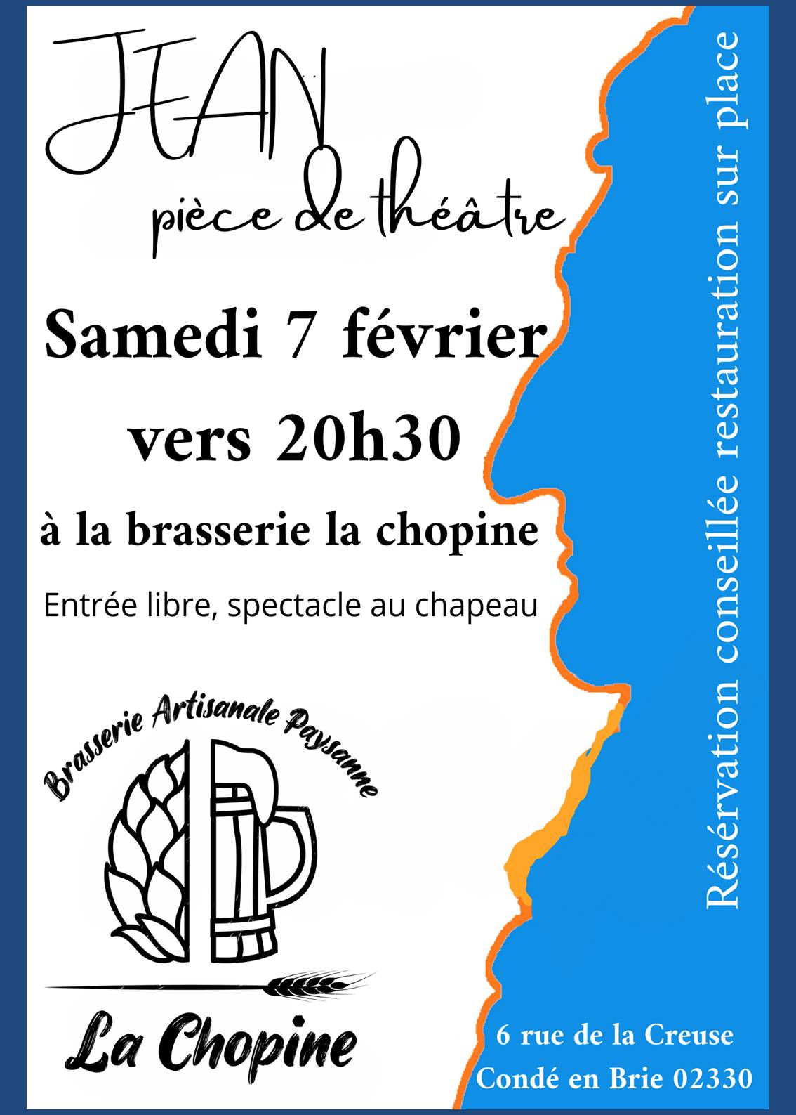 La brasserie LA CHOPINE, à Condé en Brie, présente la pièce de théâtre "JEAN". Restauration sur place. Réservez votre place dès à présent !