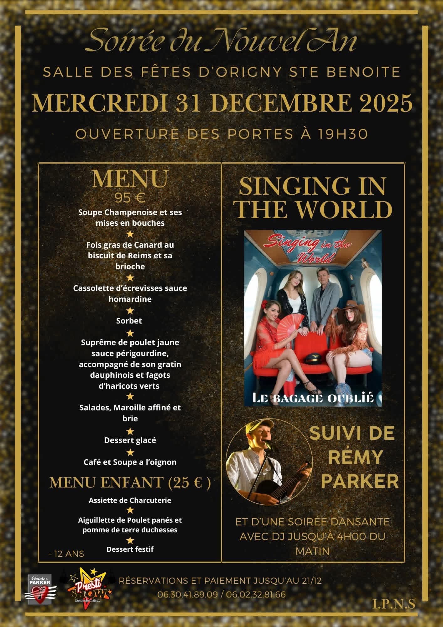 Cette année, on compte les dernières secondes de 2025 en musique ! Direction Origny-Sainte-Benoite pour une soirée exceptionnelle pour célébrer l’arrivée de la nouvelle année dans la bonne humeur et le partage. Au programme : - Singing in the World ouvrira la soirée avec un concert plein d’énergie et de reprises incontournables. - La fête se poursuivra sur la piste avec Rémy Parker,. - Puis un DJ prendra le relais pour danser jusqu’au bout de la nuit ! Ambiance festive, convivialité et bonne humeur : tout est réuni pour commencer 2026 du bon pied ! - Salle des fêtes d’Origny-Sainte-Benoite - À partir de 19h30 Menu : - 95€ / adulte - 25€ par enfant Réservation et paiement jusqu'au 21 décembre / 0630418909