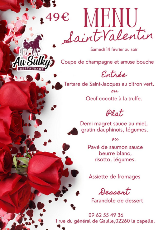 Venez fêter la Saint Valentin le soir du 14 février 2026 Au restaurant Au Sulky Au Menu 49€00 "Hors boissons" - Coupe de Champagne et amuse bouche. Entrée : Tartare de Saint Jacques au citron vert ou Oeuf cocotte à la truffe. Pla t: Demi magret sauce au miel, gratin dauphinois, légumes ou pavé de saumon sauce beure blanc, risotto, légumes. Assiette de Fromages. Dessert : Farandole de dessert.