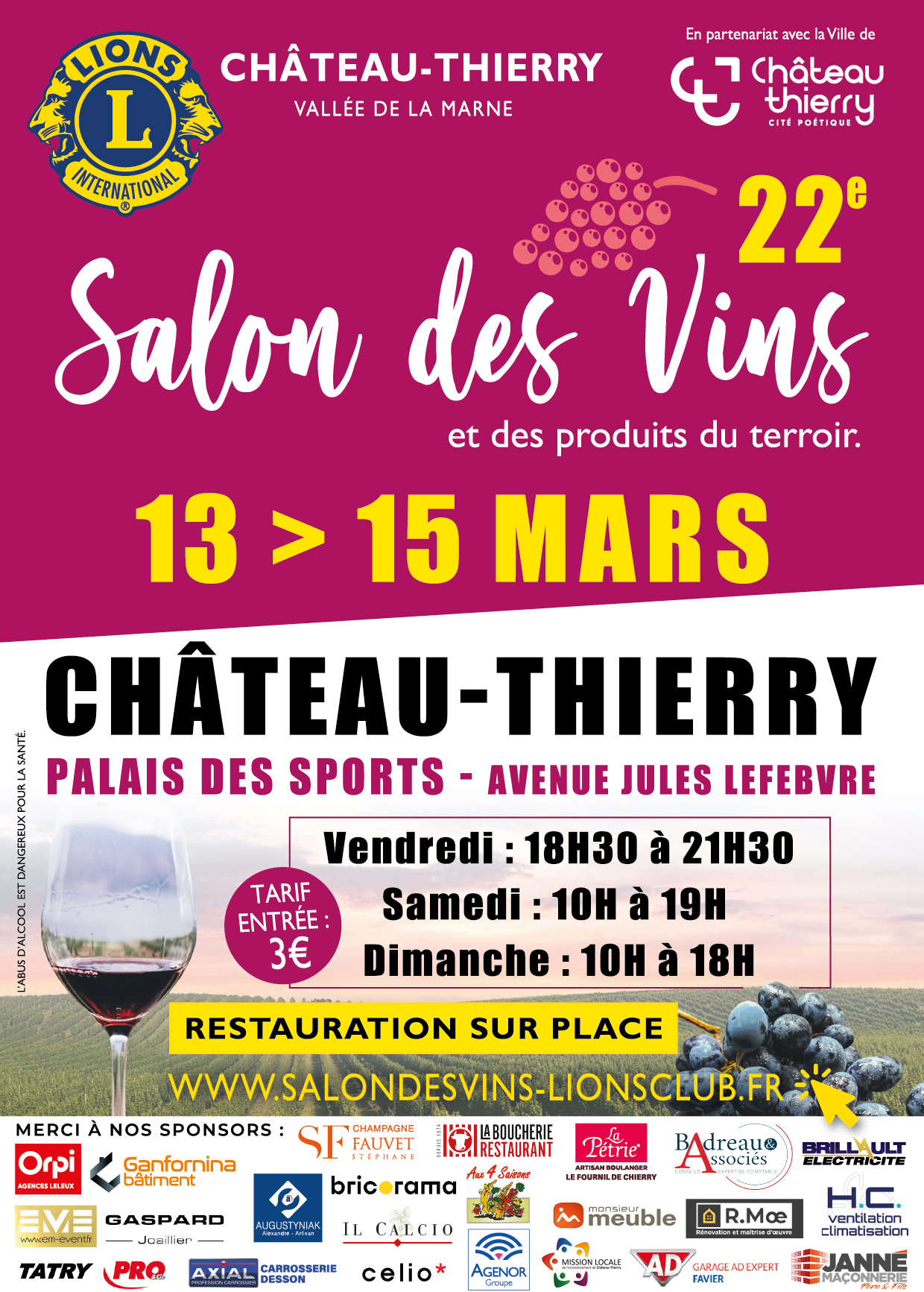Le Salon des Vins et des Produits du Terroir vous donne rendez-vous pour sa 22ᵉ édition à Château-Thierry ! 🎉 📍 Retrouvez les au Palais des Sports pour un week-end placé sous le signe de la convivialité et du partage : 🍷 Vendredi 13 mars | 18h30 – 21h30 👉 Soirée d’ouverture avec bar à huîtres 🍷 Samedi 14 mars | 10h – 19h 👉 Restauration le midi & bar à huîtres 🍷 Dimanche 15 mars | 10h – 18h 👉 Restauration le midi & bar à huîtres ✨ Au programme : 🔸 Plus de 40 exposants venus des plus belles régions viticoles et terroirs de France 🔸 Dégustations & rencontres avec des producteurs passionnés 🔸 Une ambiance chaleureuse et festive ❤️ Un salon solidaire ! Les bénéfices permettent à des enfants de Château-Thierry et des environs de partir en colonie de vacances grâce au Lions Club. 👉 Découvrez la programmation 2026 et la liste des exposants sur : www.salondesvins-lionsclub.fr