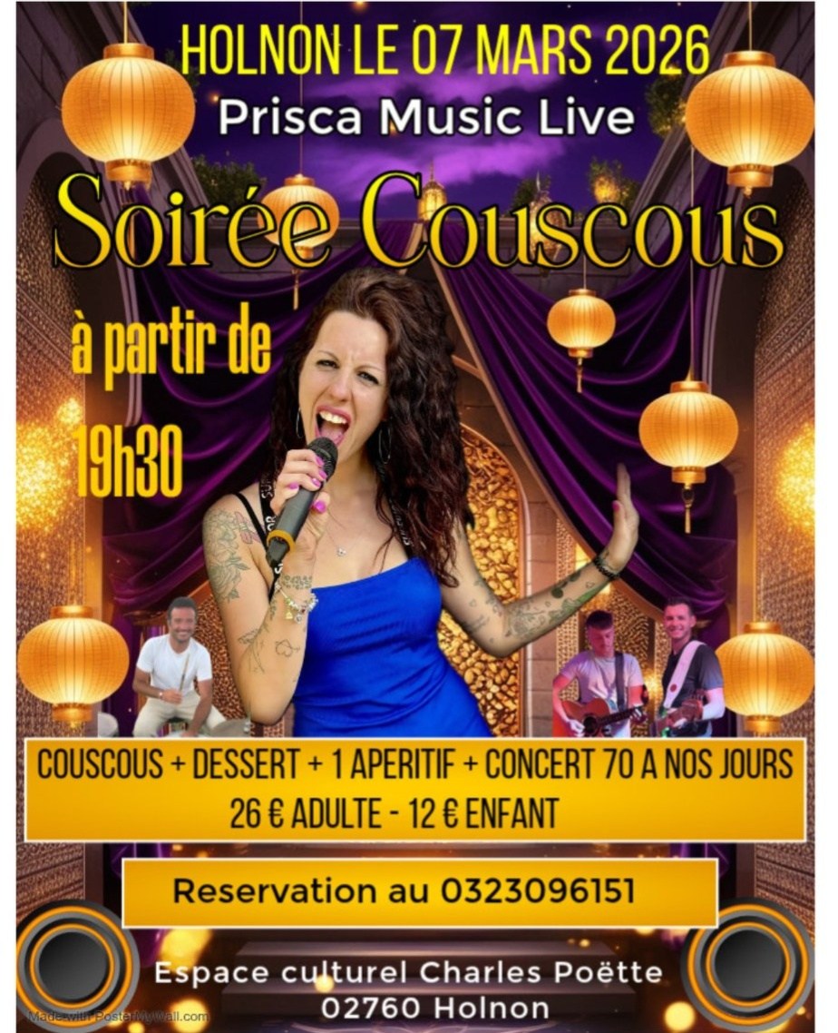 Le samedi 7 mars, venez paticiper à une soirée couscous à Holnon ! Rendez-vous à 19h30 à l'espace culturel Charles Poëtte. Animé par Prisca Music Live. Tarif adulte 26€ Tarif enfant 12€ Réservation au 03 23 09 61 51