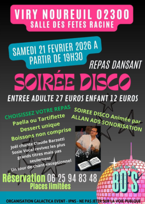 Rendez-vous le samedi 21 février à partir de 19h30 pour découvrir la soirée disco à Viry Noureuil . Au programme Un repas dansant aux saveurs conviviales (paella ou tartiflette, dessert unique, boissons non comprises), suivi d’une soirée disco autour d’un concert exceptionnel de Joël, sosie vocal de Claude Barzotti. Revivez les plus grands titres des années 80… et bien plus encore ! Tarifs : Adulte 27 € Enfant 12 € Sur réservation. Place limitées. Information au 06 25 94 83 48.