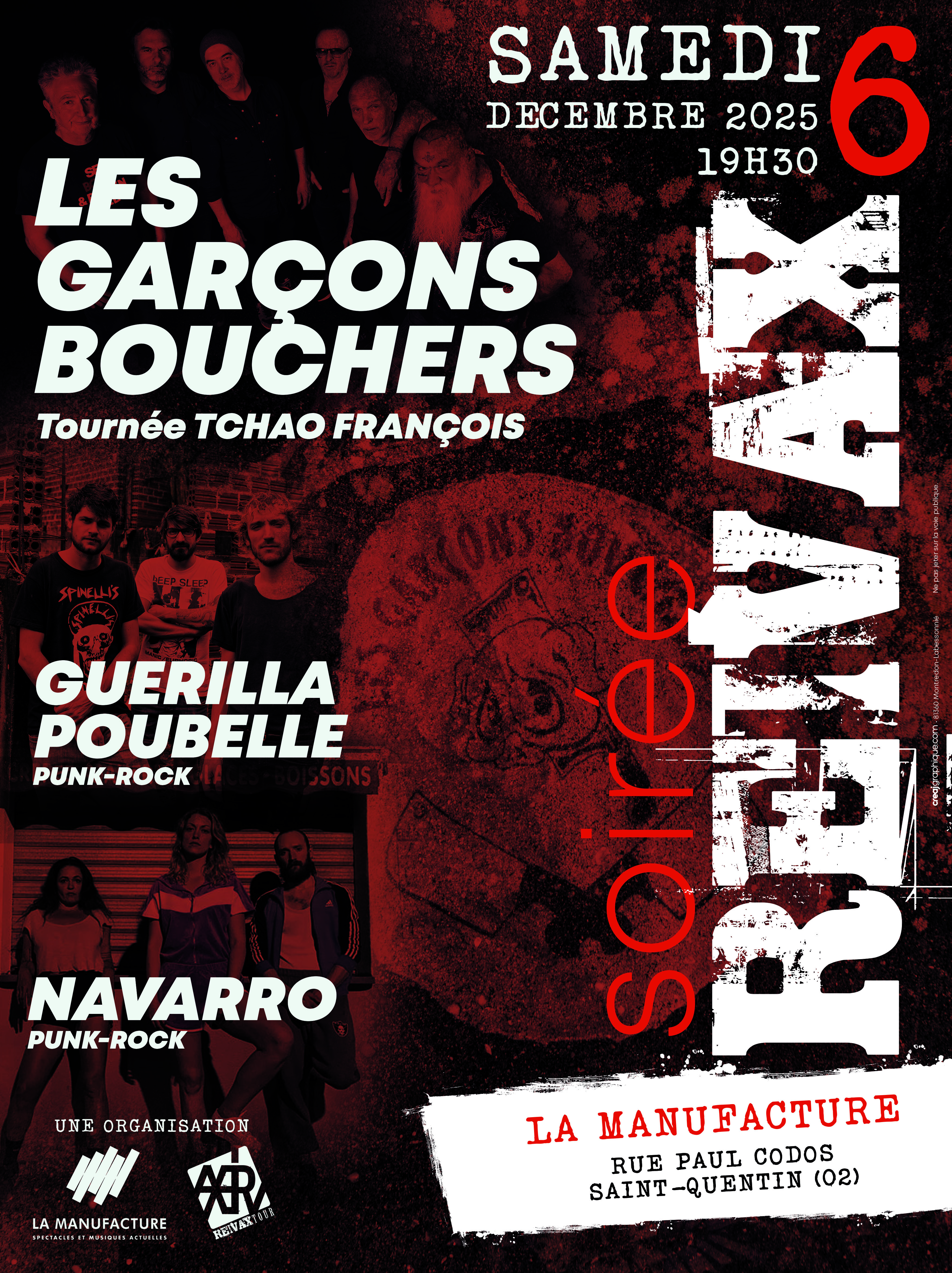 L’association Reivax s’installe à la Manufacture et vous propose trois groupes incontournables de la scène punk française. Les Garçons Bouchers : Groupe phare de la scène rock alternative française, Les Garçons Bouchers poursuivent leur tournée Tchao François pour offrir un mélange unique de punk, rock et chansons françaises. Avec leur énergie débordante et leurs textes acerbes, ils rendent hommage à leur mentor, François Hadji-Lazaro, tout en continuant à secouer le public avec leur style inimitable et leurs riffs percutants. Une tournée à ne pas manquer pour les amateurs de musique engagée et festive ! Guerilla Poubelle Préparez-vous à vivre une soirée explosive avec Guerilla Poubelle, groupe iconique de punk français. Avec leur énergie débordante et leurs textes percutants, les Guerilla Poubelle vont secouer la scène et offrir une performance digne de son répertoire engagé. Si vous êtes fan de punk, de rythmes effrénés et de paroles qui décoiffent, ce concert est fait pour vous ! Navarro Navarro, groupe de punk-rock français, est reconnu pour son style énergique et son attitude sans compromis. Avec des riffs percutants et des textes empreints de rébellion, ils mélangent habilement punk, rock et une dose de ska pour offrir une expérience musicale explosive. Leur scène est un terrain de jeu idéal pour les fans de son brut et de révolte joyeuse !
