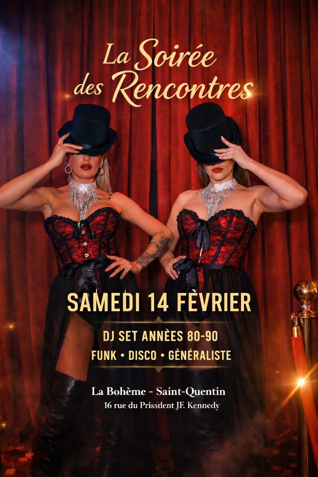 La Soirée des Rencontres Spéciale Saint-Valentin le vendredi 14 février 2026 à La Bohème Ouverture à partir de 22h DJ SET Années 80–90 Funk Disco Généraliste Une soirée conviviale et festive, placée sous le signe des rencontres, de la musique et du partage. Venez vibrer, danser et faire de belles découvertes dans une ambiance chaleureuse et décontractée. Entrée 10€ avec une consommation. Réservez par : Téléphone : 0781240207 bohemereservation@gmail.com Tenue correcte exigée. Nos agents de sécurité se réservent le droit de refuser l’entrée si les conditions ne sont pas respectées. 16 rue du Président JF Kennedy, 02100 Saint Quentin