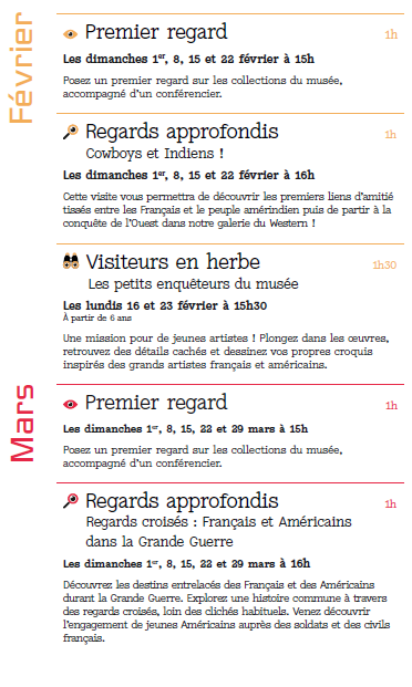 Rendez-vous à 15h30 le 16 et 23 février pour un atelier au Musée Franco-Américain de Blérancourt. Une mission pour de jeunes artistes ! Plongez dans les oeuvres, retrouvez des détails cachés et dessinez vos propres croquis inspirés des grands artistes français et américains. A partir de 6 ans. Durée: 1h30 Réservations: 03 44 38 47 10 / reservation.blerancourt@culture.gouv.fr Tarifs: 1 accompagnateur gratuit et obligatoire: 7€.