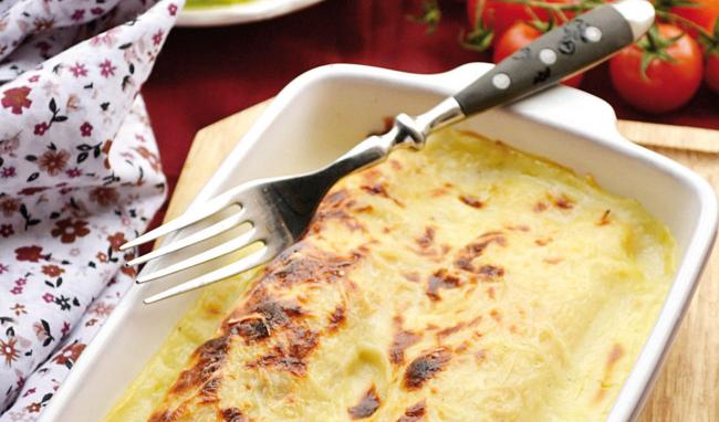Disposer les crêpes dans un plat à gratin, napper avec le reste de crème fraîche et parsemer de fromage râpé.