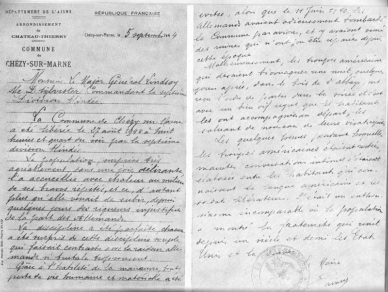 Lettre de la commune de Chézy-sur-Marne au général Sylvester ©Archives de la 7th Armored Division