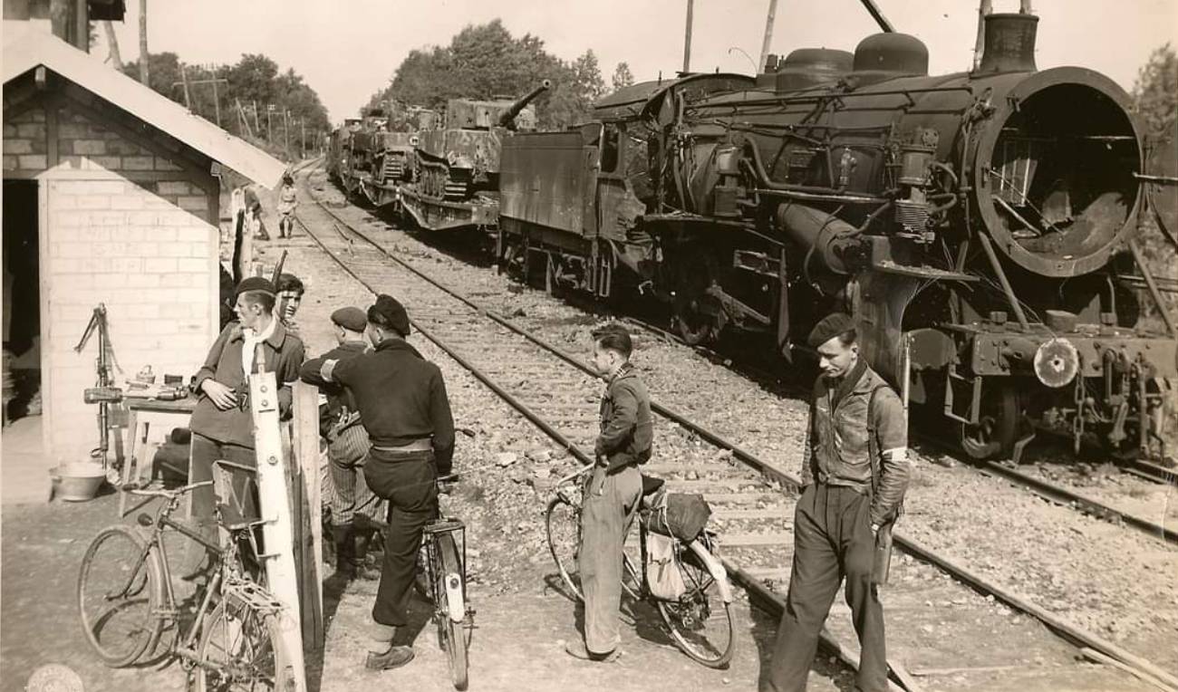 Le train allemand détruit en gare de Braine et les FFI qui montent la garde