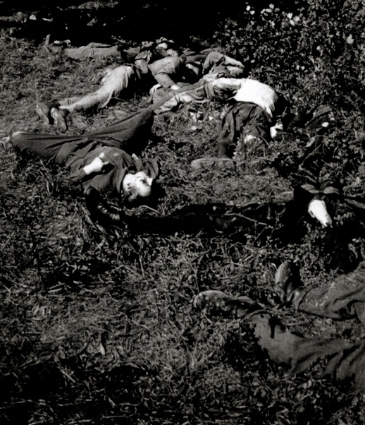 Certains corps seront effectivement tailladés et défigurés à coups de baïonnettes, avant que les SS ne quittent les lieux du massacre.