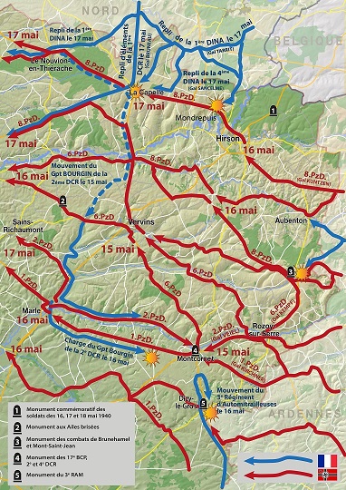 Dès la journée du 13 mai, les 18e et 22e divisions d’infanterie (DI) du 11e corps d’armée d’une part, et les 61e et 102e divisions d’infanterie du 41e corps d’armée sont disloquées et contraintes au repli. Sous le couvert des bois et le mitraillage incessant de l’aviation allemande, les unités encore organisées, mais le plus souvent constituées en groupements, tentent ainsi de se replier vers l’Ouest, à travers le département des Ardennes, durant les journées du 14 et du 15 mai 1940, et atteignent les limites du département de l’Aisne.