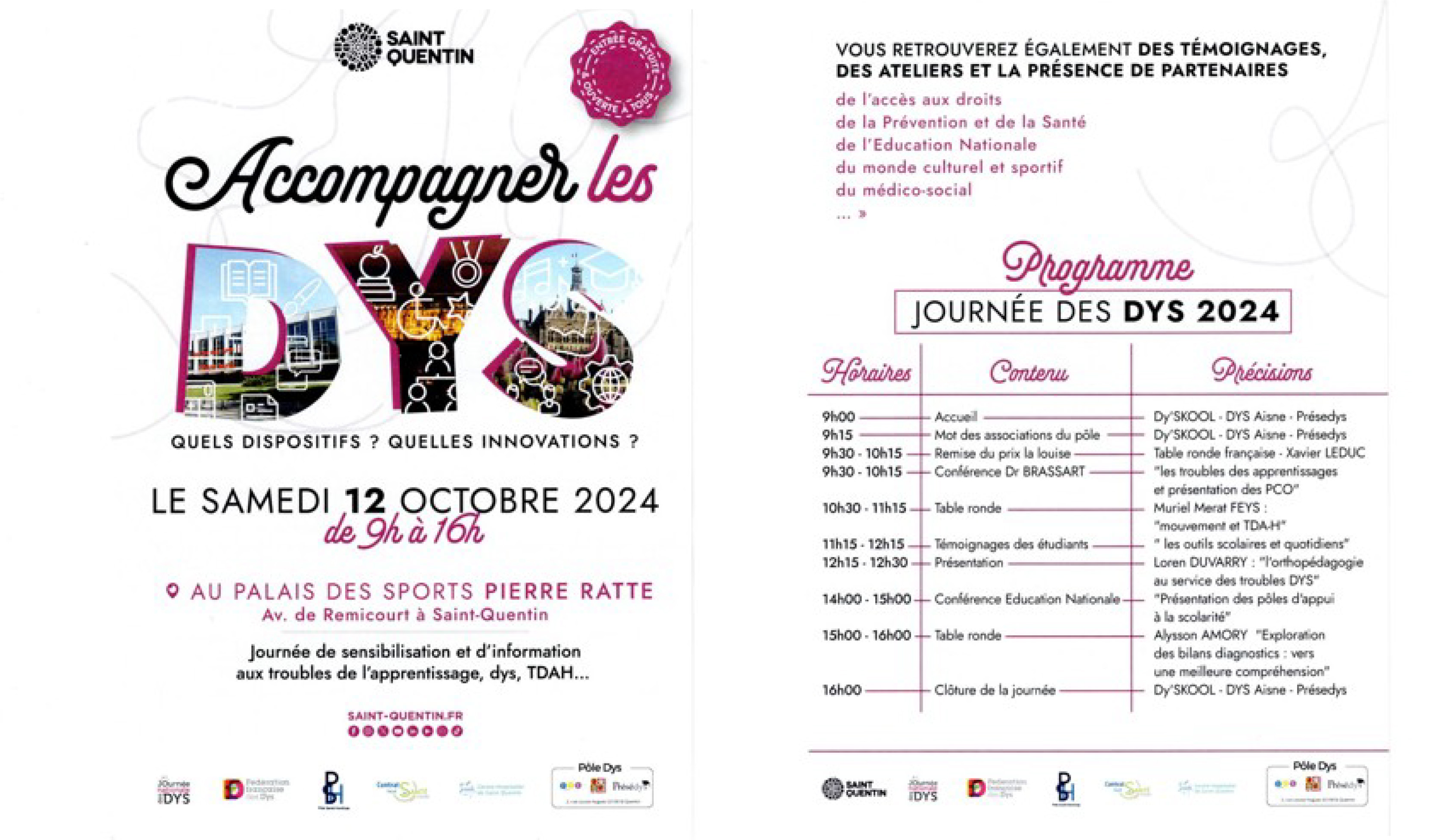 Le docteur Caroline Brassart, pédiatre au Centre Hospitalier de Saint-Quentin, donnera une conférence sur les troubles Dys lors des deux événements et les visiteurs auront également l’occasion de rencontrer de nombreuses professions impliquées dans la gestion de ces troubles : orthophoniste, ergothérapeute, neuropsychologue, orthoptiste, psychomotricienne… Témoignages et ateliers sur les question d’accès aux droits ou de scolarité avec des représentants de l’Éducation Nationale sont également au programme.