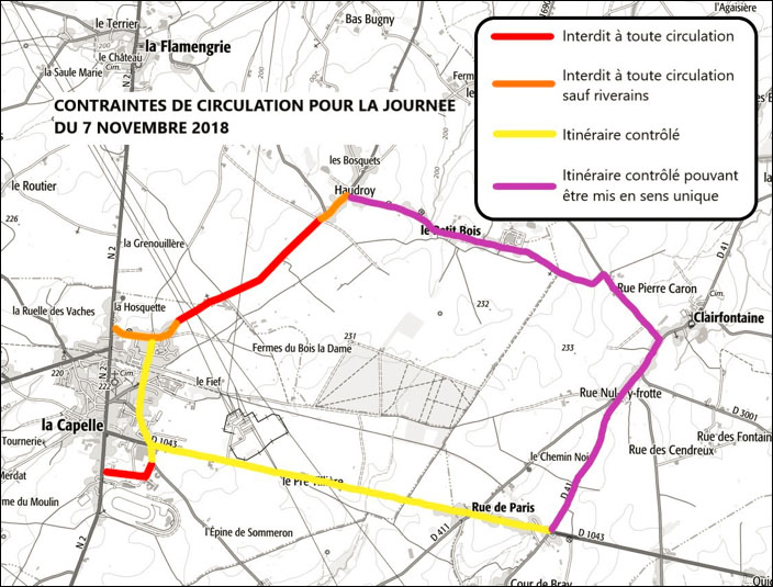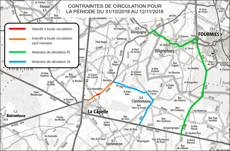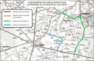 Les impératifs de préparation et de déroulement de ces évènements auront un impact sur la circulation routière du secteur concerné. Ainsi, la RD285 reliant La Capelle et le hameau d’Haudroy pourra être coupée à la circulation sur une période comprise entre le 30 octobre et le12 novembre 2018. Les véhicules légers pourront contourner la route coupée par Clairfontaine, les poids lourds étant quant à eux redirigés vers Fourmies.