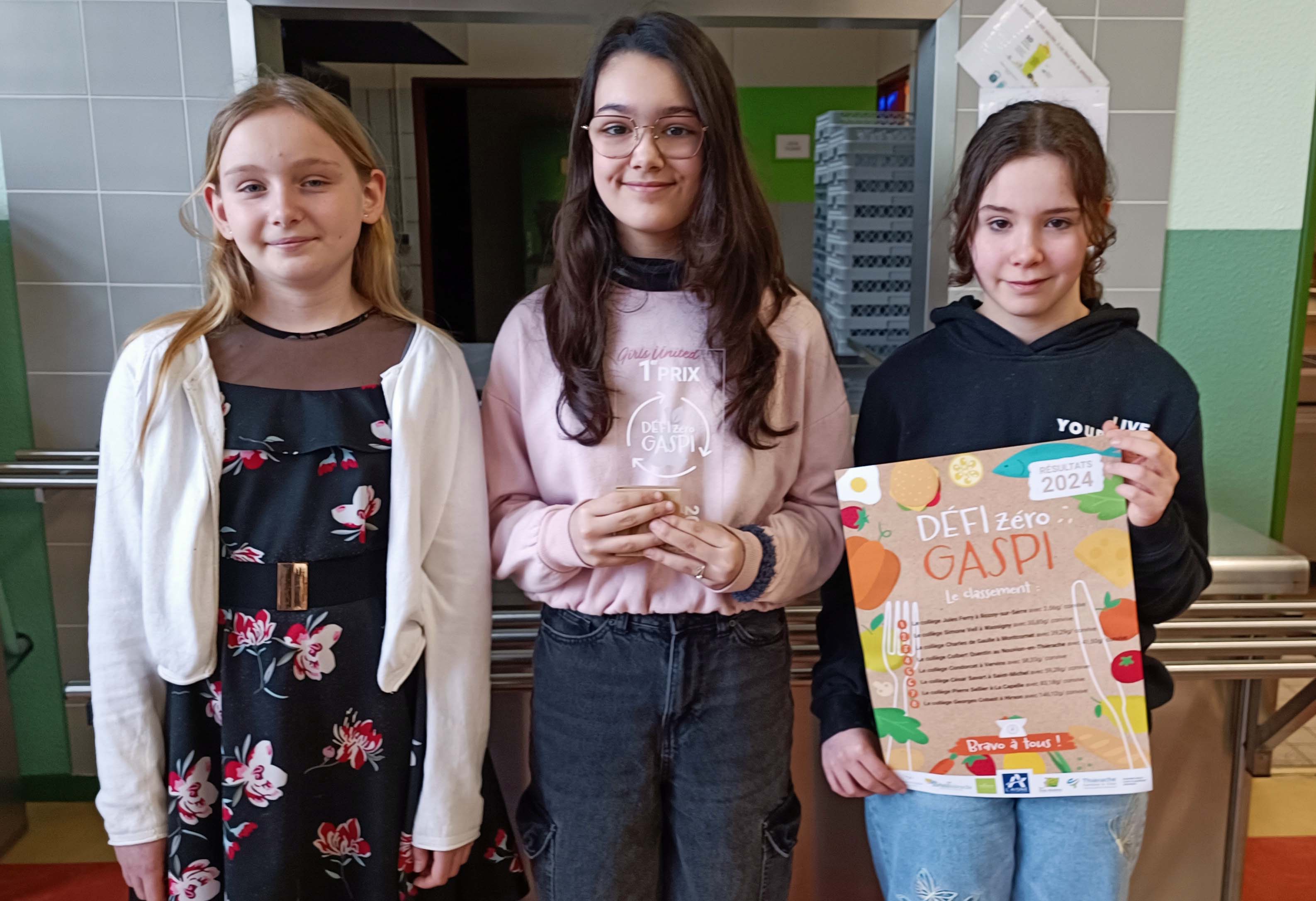 Le trophée a été remis à 3 éco-déléguées : Heleen et Morgane, élèves de 5e, et Lila, élève de 4e. Elles représentaient la vingtaine d’éco-délégués actifs au sein de l’établissement, chargés de sensibiliser les élèves au gaspillage alimentaire, notamment par le biais d’articles dans le journal du collège.