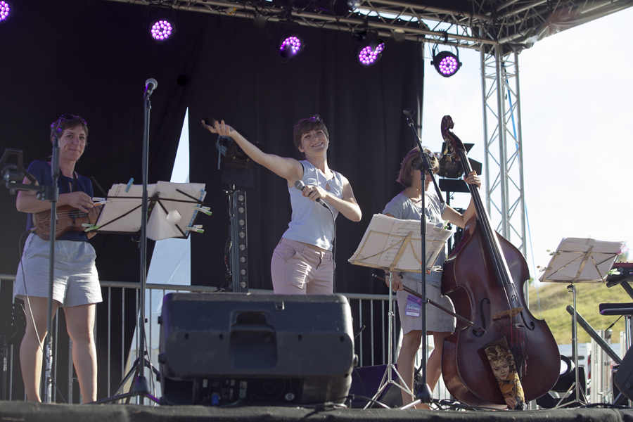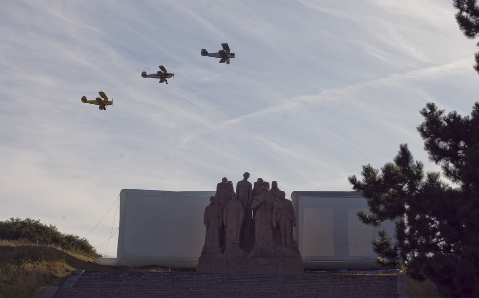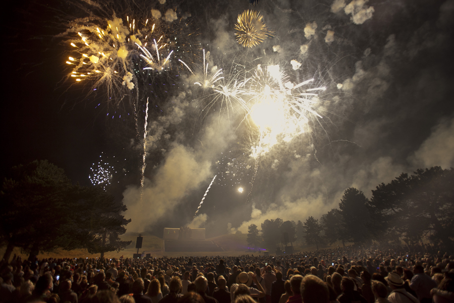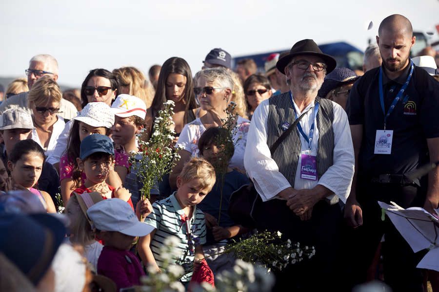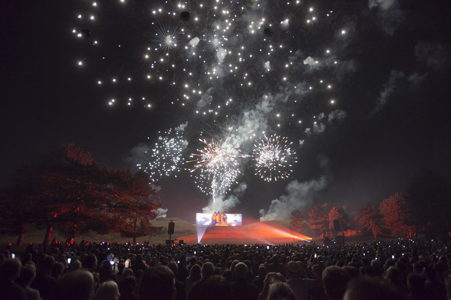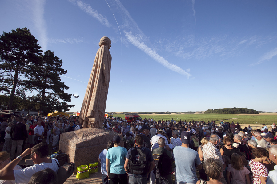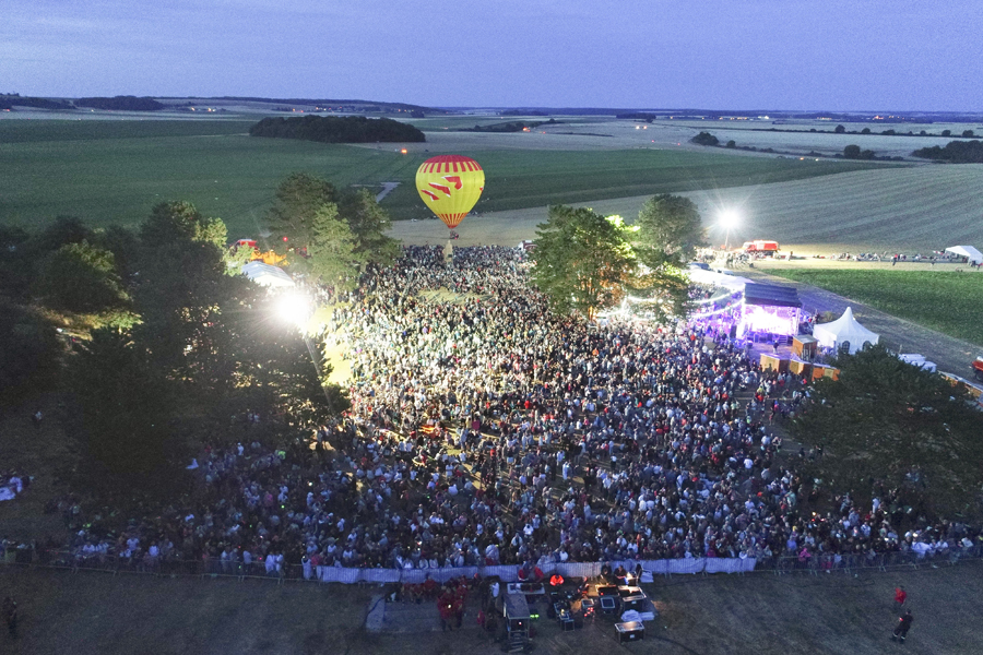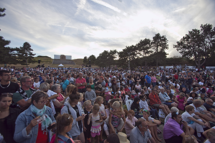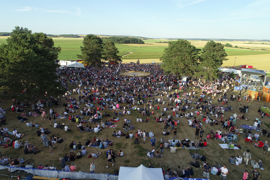 Rarement la Butte Chalmont avait vu une telle affluence. Dès l’ouverture des portes à 18h00, le site où se dresse la monumentale statue « Les Fantômes » du sculpteur Paul Landowski a été pris d’assaut par une foule enthousiaste et très familiale. Cent plus tôt, à cet endroit précis se décidait le sort de la 2nde Bataille de la Marne qui allait amener les troupes alliées jusqu’à la victoire. C’est au pied de la grande statue qui symbolise La France, à l’entrée du site, que les officiels se sont d’abord rendus, aux côtés de Nicolas Fricoteaux, président du Conseil départemental de l’Aisne, pour un vibrant hommage aux soldats qui sont morts sur ce champ de bataille. Les nombreux enfants présents étaient conviés à déposer des fleurs au pied de la statue tandis que le trio féminin « Les Dames Belettes » entonnait quelques airs biens connus du temps des tranchées.