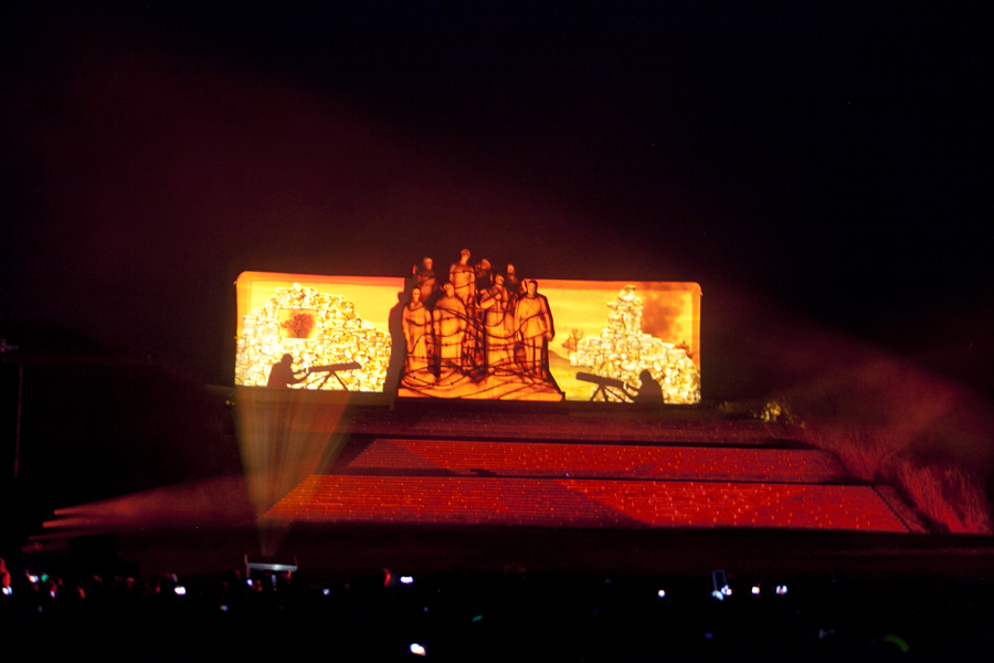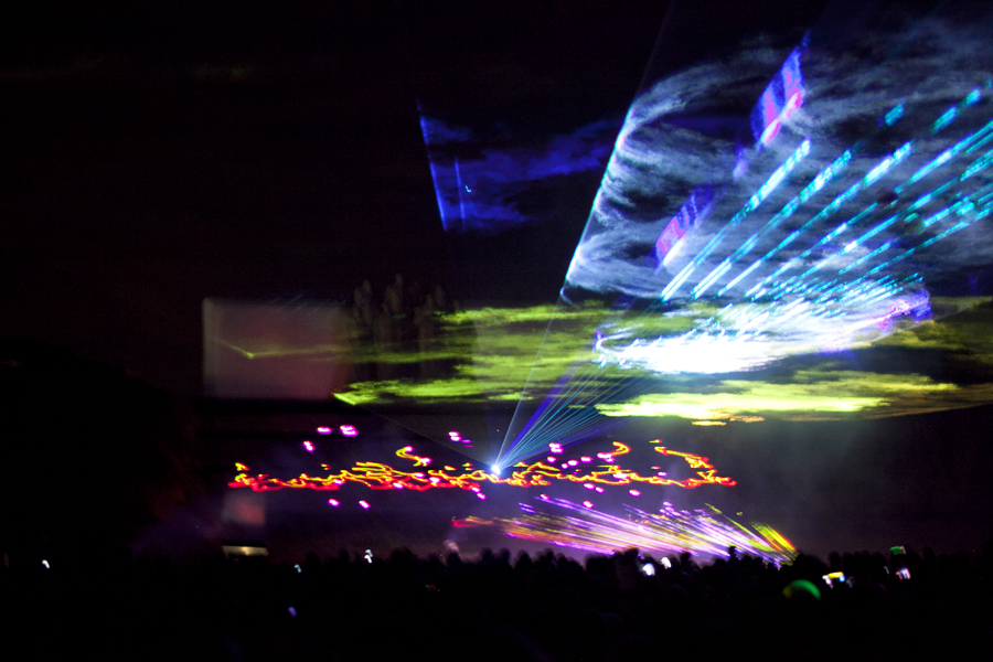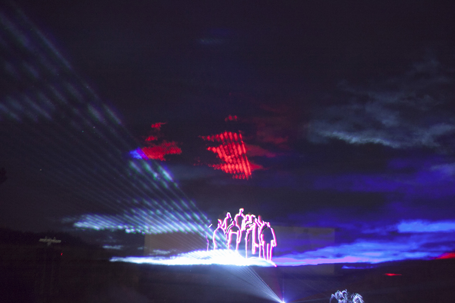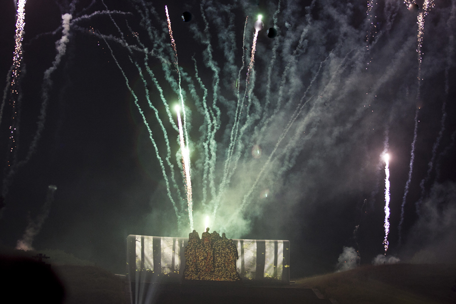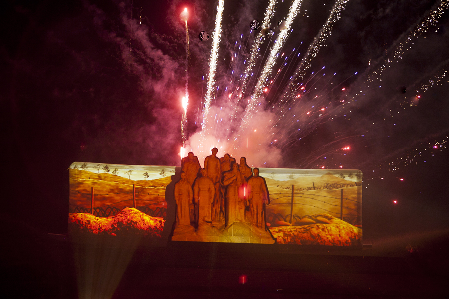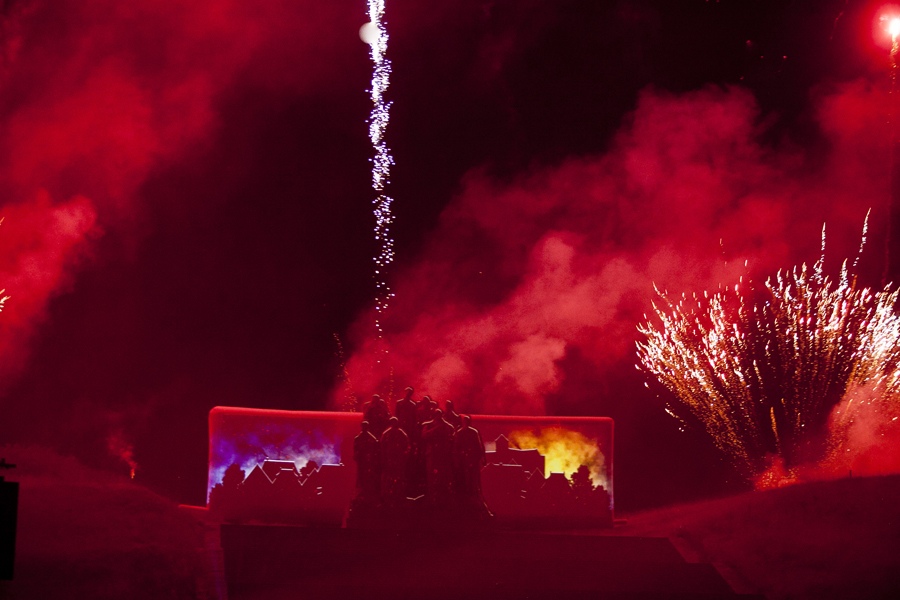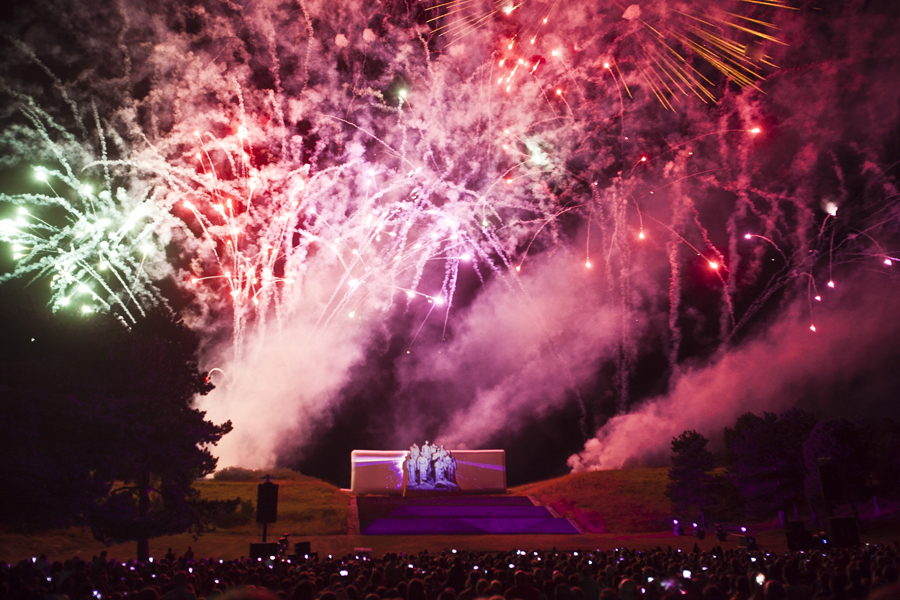 A 22h30, la nuit ayant pris possession de la plaine, le spectacle de feu et lumière "Les Fantômes", créé pour cette occasion par la société Eurodrop, était lancé. Féérie de laser pour commencer, inondant l’air ambiant de vague de couleurs et projetant des images évocatrices de la Grande Guerre sur le monument des Fantômes avant de monter en puissance comme un tir de barrage d’artillerie mettant le ciel axonais à feu et à sang. Revenant à la vie par la magie des images, les Fantômes de Landowski devenaient à la fois les témoins et le tableau vivant de quatre années de guerre tandis que se déchainait un véritable déluge de feu, pour le plus grand bonheur de la foule ébahie.