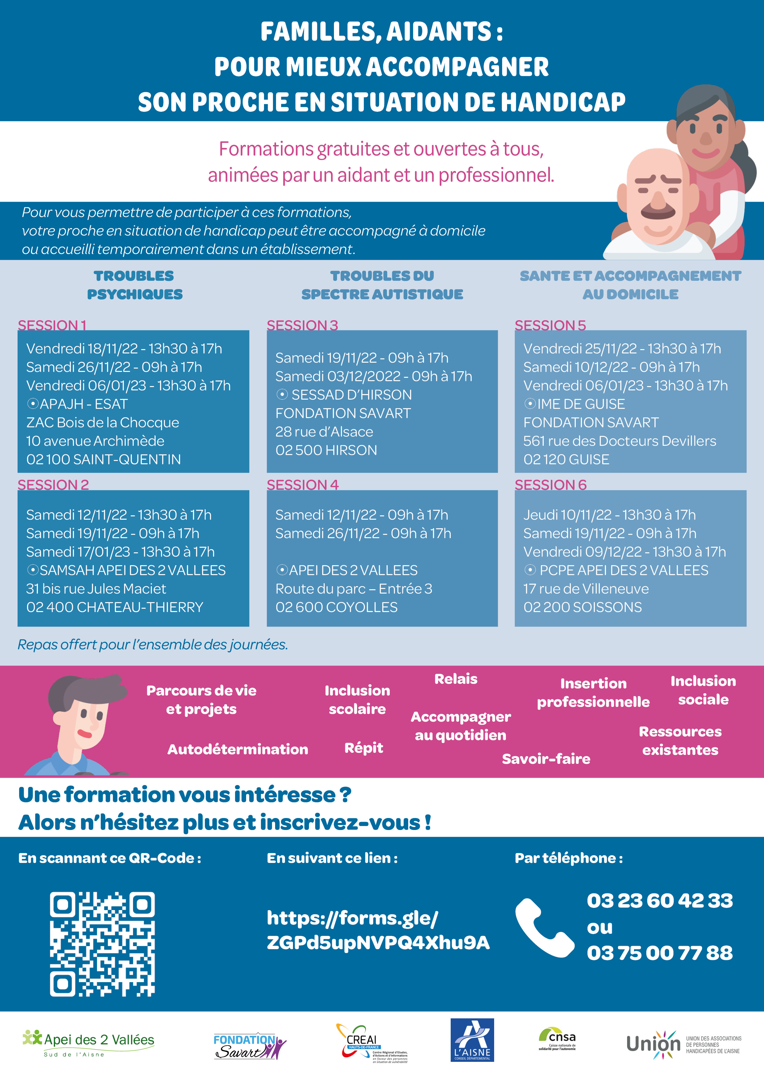 Troubles psychiques, Troubles du spectre autistique, Santé et accompagnement au domicile, découvrez-ci-après le calendrier des formations proposées et organisées en 2 sessions pour chacun des thèmes. Le repas sera offert pour l’ensemble des journées :