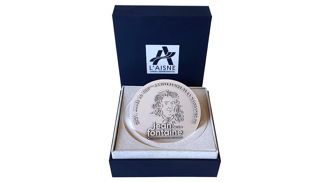 En 2021, la médaille annuelle du Conseil départemental est dédiée à Jean de La Fontaine, à l’occasion du 400e anniversaire de sa naissance à Château-Thierry. Cette médaille s’inspire de l’identité graphique de l’année partagée avec la ville de Château-Thierry et la préfecture de l’Aisne. Elle sera accompagnée d’un livret mettant à l’honneur une fable « Le cheval et l’âne » dont le 1er vers « En ce monde, il se faut l’un l’autre secourir » pourrait être choisi comme devise du Département, chef de file des solidarités humaines.