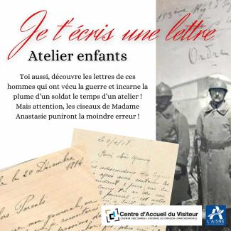 L'atelier "Je t'écris une lettre..." est proposé aux enfants de 9 à 12 ans qui incarnent les combattants au front, les familles de l'arrière et le service de censure pendant la Première Guerre mondiale. Cet atelier permet de faire découvrir aux plus jeunes l'importance du courrier et l'existence du service de censure lors de la Grande Guerre. Les parents peuvent participer à l'atelier avec leur(s) enfant(s).