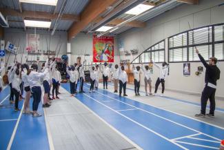 « On va commencer par le salut à l’adversaire qui se décompose en trois mouvements : arme tendue vers le haut, on redescend le pommeau à hauteur du menton et on termine par un balayement vers le sol. Ciel, vie, terre ! » La trentaine de collégiens exécute consciencieusement les consignes données par Corentin Baron, compétiteur aguerri et maître d’armes du Cercle d’escrime de Soissons. Un premier jeu d’initiation est proposé, il faut toucher la tête de l’adversaire avec un fleuret qui, pour l’occasion est en plastique. Les apprentis bretteurs sont harnachés de pied en cap et le masque de protection est bien sûr obligatoire. Même avec une arme en plastique, ce serait bête d’éborgner un camarade.