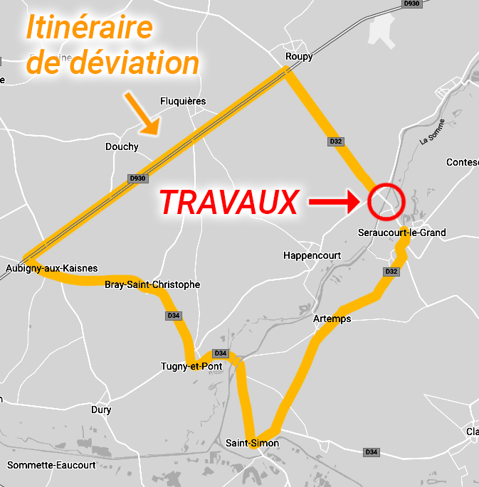 Durant les travaux, la circulation des véhicules sur la RD32 devra être interrompue, l’itinéraire de déviation empruntera les routes départementales n° 32, n° 34 et n° 930, traversant les communes de Seraucourt-le-Grand, Artemps, Saint-Simon, Tugny-et-Pont, Bray-Saint-Christophe, Aubigny-aux-Kaisnes, Fluquières et Roupy.