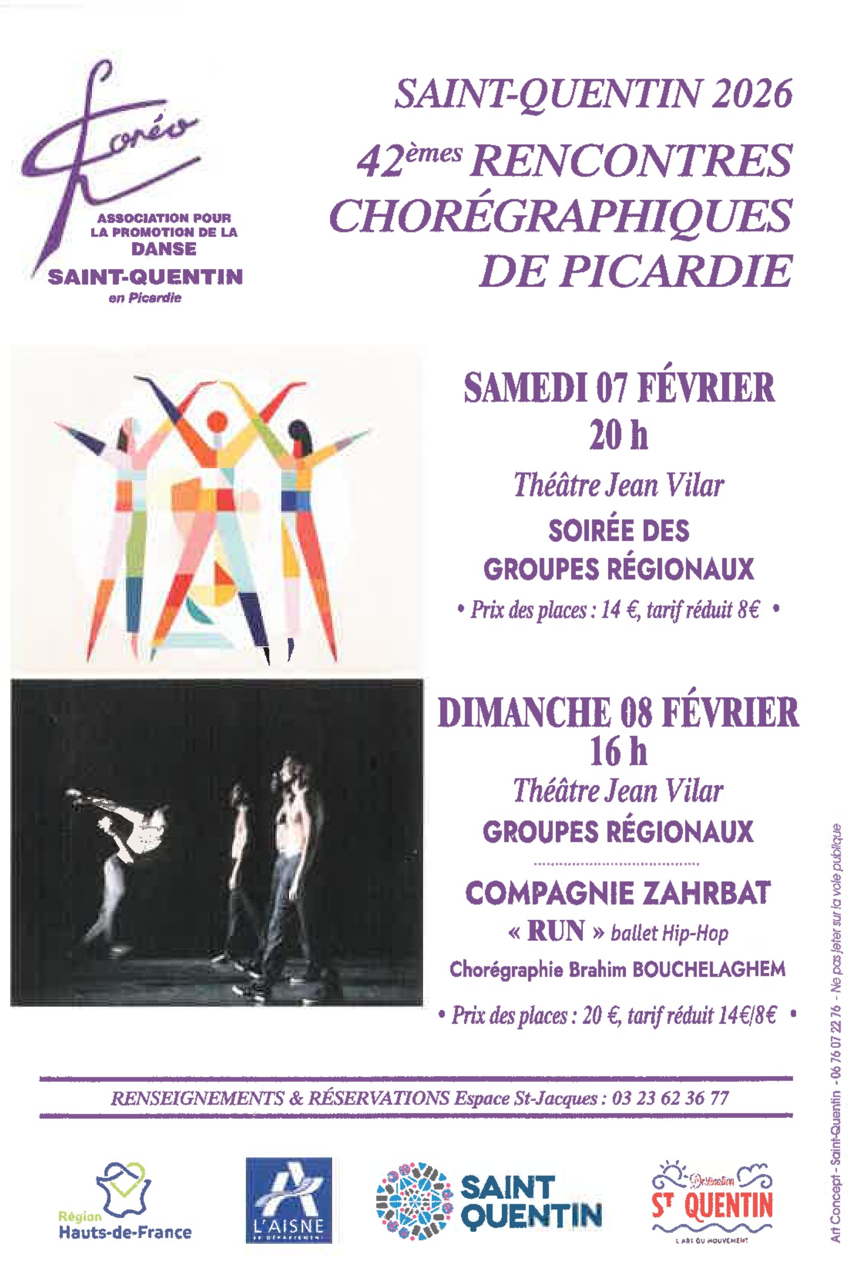 Les Rencontre Chorégraphique de Picardie reviennent pour leur 42ème édition le week-end des 7 et 8 Février ! Elles auront lieu au Théâtre Jean Vilar : - le samedi soir à 20h pour Soirée des groupes régionaux (14€, 8€ en tarif réduit) - le dimanche à 16h pour les groupes régionaux et la Compagnie Zahrbat (20€ , tarif réduit à 14€ ou 8€ en fonction des modalités) Réservations et renseignements à l'espace Saint-Jacques : 03 23 62 36 77