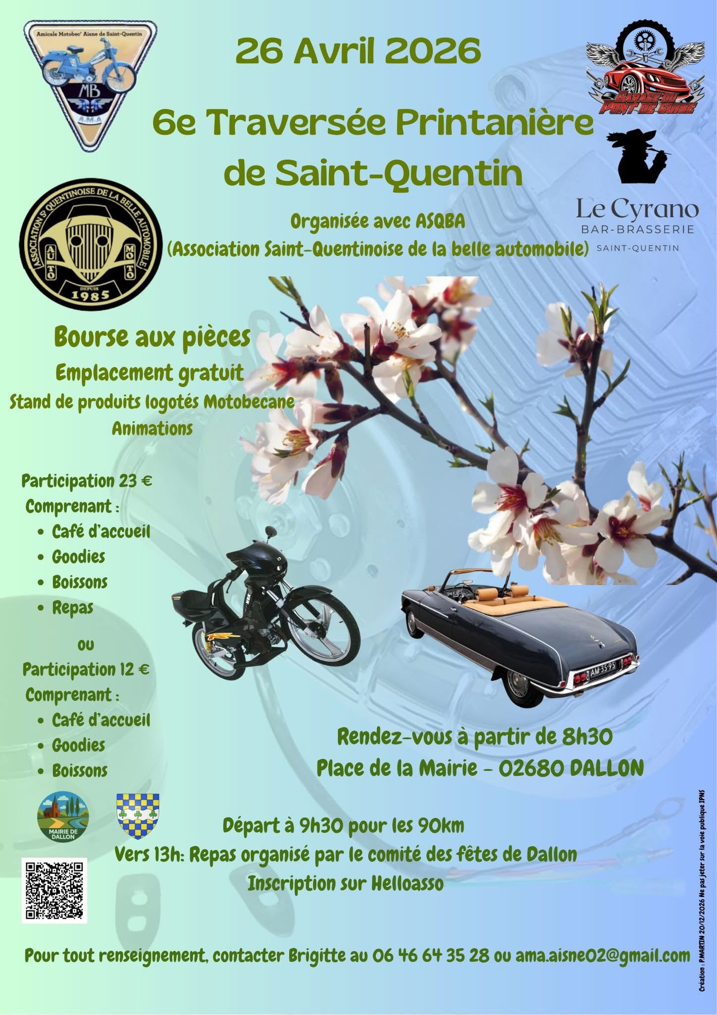 Rendez-vous le dimanche 26 avril 2026 pour la 6ème Traversée Printanière de Saint-Quentin, organisée par l'association Motobec'Aisne et l'association Saint-Quentinoise de la belle automobile. Départ de Dallon (place de la mairie) à 9h30. Comme pour les autres traversées, celle-ci est ouverte à tous les cyclomoteurs, vélos, motos & voitures d’époque de toute marque AVANT 1993. 90 km seront parcourus dans le Saint-Quentinois. Exposition à Dallon des cyclomoteurs et véhicules : avant le départ (à partir de 8h30) et pendant le temps du déjeuner (vers 13h). Participation de 12€ (sans repas) ou 23€ par personne. Inscription sur HelloAsso. Renseignements au 06 46 64 35 28 ou ama.aisne02@gmail.ccom