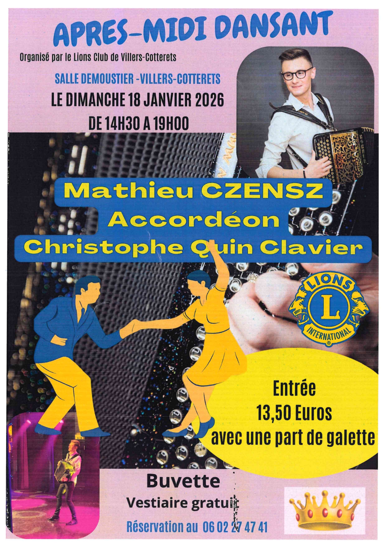 Après-midi dansant organisé par le Lions Club de Villers-Cotterêts au rythme de l'accordéon avec Mathieu Czensz et Christophe Quin Clavier. Galette des rois, buvette et vestiaire sur place. Réservation au 06 02 27 47 41