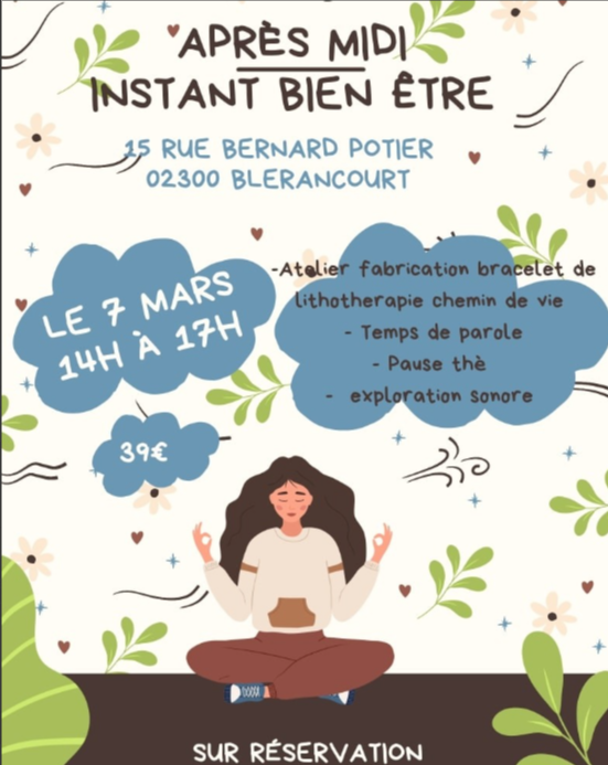 Après-midi instant bien-être le 7 mars 15 rue Bernand Potier à Blérancourt de 14h à 17h. Au programme: Atelier fabrication de bracelet de lithothérapie Temps de parole Pause thé Exploration sonore Tarif : 39€ Sur réservation : 07 81 98 58 10