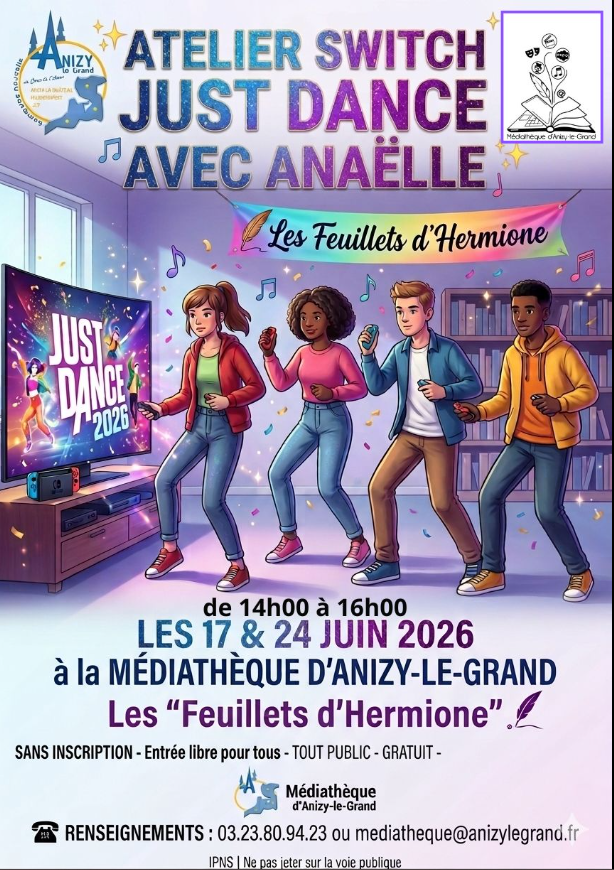 Rendez-vous pour un atelier Switch Just Dance, les 17 ET 24 Juin 2026,de 14h à 16h, à la médiathèque d'Anizy-Le-Grand, "Les feuillets d'Hermione" . Avec la participation d'Anaelle pour l'animation. Cet atelier est tout public, gratuit et sans inscription. Renseignements: : 7 bis Rue de l'Aigle Noir, 02320 Anizy-le-Grand 03.23.80.94.23 mediatheque@anizylegrand.fr