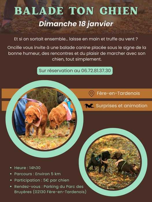 BALADE TON CHIEN Dimanche 18 janvier Et si on sortait ensemble… laisse en main et truffe au vent ? Oncille vous invite à une balade canine placée sous le signe de la bonne humeur, des rencontres et du plaisir de marcher avec son chien, tout simplement. Sur réservation au 06.72.81.37.30 📍 Fère-en-Tardenois 🐾 Surprises et animation Informations pratiques : • Heure : 14h30 • Parcours : Environ 5 km • Participation : 5€ par chien • Rendez-vous : Parking du Parc des Bruyères (02130 Fère-en-Tardenois)