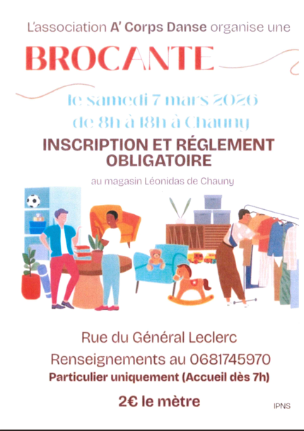 Rendez-vous le samedi 7 marsde 8h à 18h à Chauny pour la brocante rue du Général Leclerc et une partie de la rue Aristide Briand. Inscription et règlement obligatoire au magasin Léonidas, particulier uniquement. 2€ le mètre. (accueil dès 7h)