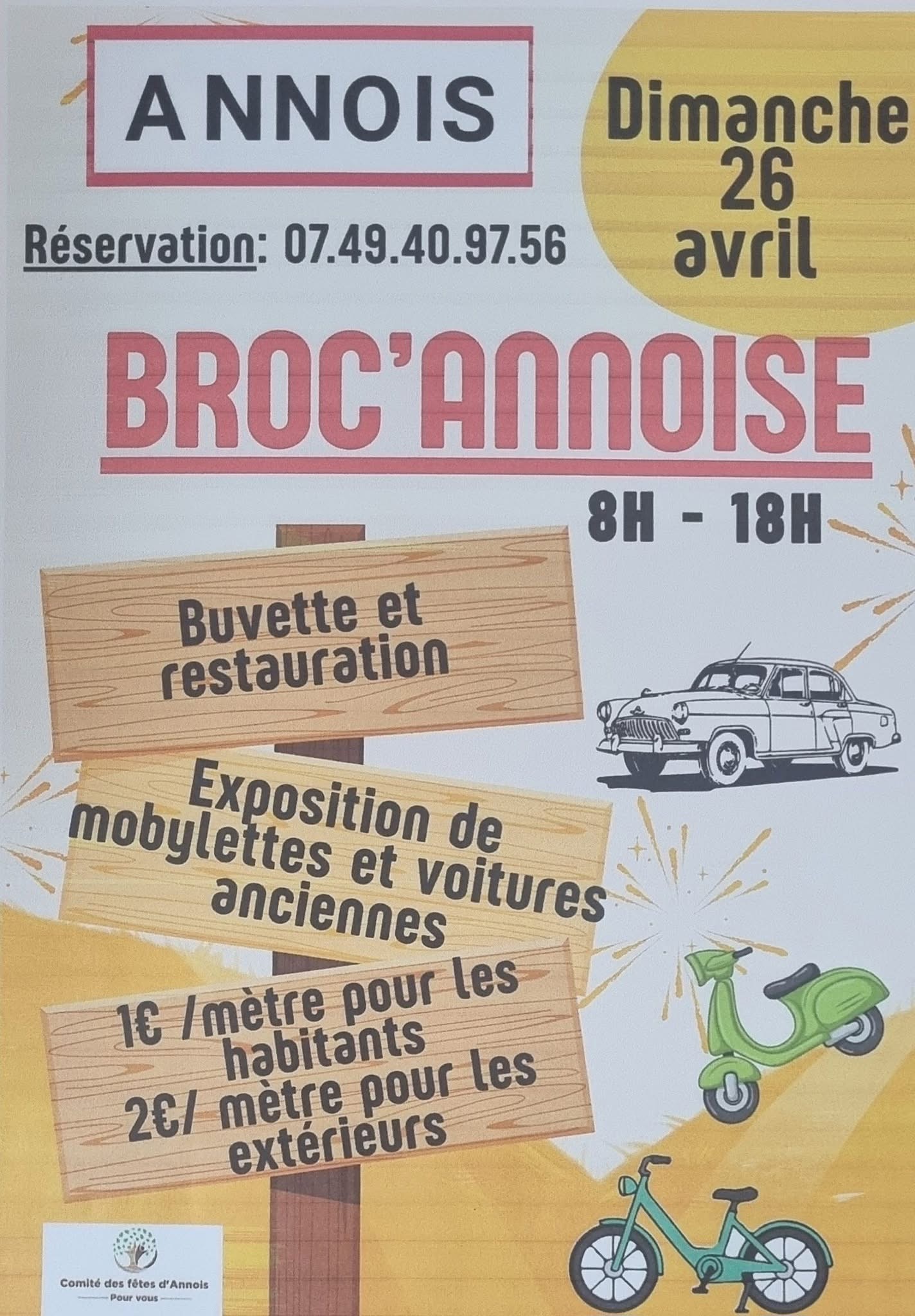 Venez découvrir la brocante d'Annois et une exposition de mobylettes et voitures anciennes le dimanche 26 avril 2026 de 8h à 18h rue de la mairie. Restauration et animations sur place. Organisation : Comité des fêtes d'Annois. Renseignements et réservation pour les exposants au 07.49.40.97.56