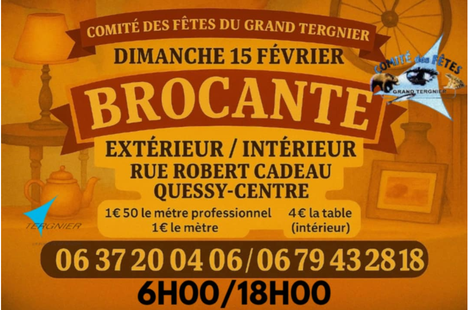 Rendez-vous le dimanche 15 février de 6h à 18h pour la brocante des comité des fêtes du grand Tergnier. Au programme une brocante intérieure et extérieure, ouverte à toutes et tous, accessible aux personnes en situation de handicap. Tarifs: 4€ la table (intérieur) 1€ particulier (extérieur) le mètre 1.50 € professionnels (extérieur) le mètre Informations au 06 37 20 04 06 ou au 06 79 43 28 18