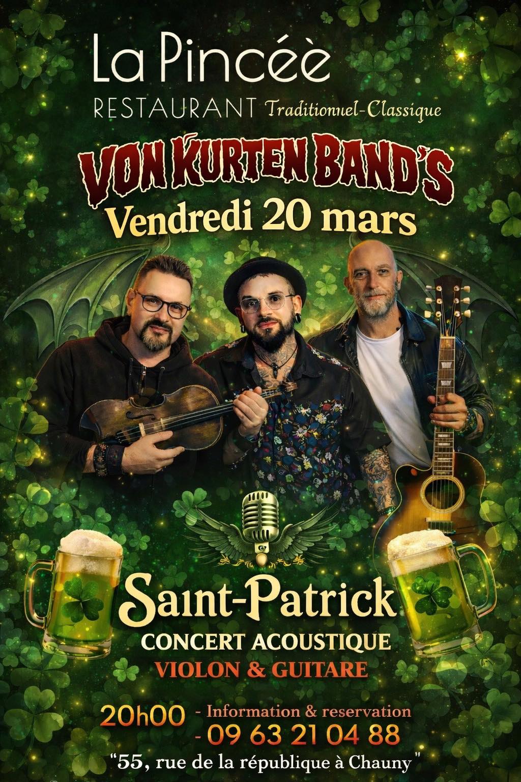 Concert acoustique pour la Saint-Patrick à La Pincée le vendredi 20 mars à 20h. Au programme, violon et guitare par le groupe Von Kurten Band's. Information et réservation au 09 63 21 04 88 ou en ligne sur le site internet restaurant-la-pincee.eatbu.com Place limitées.
