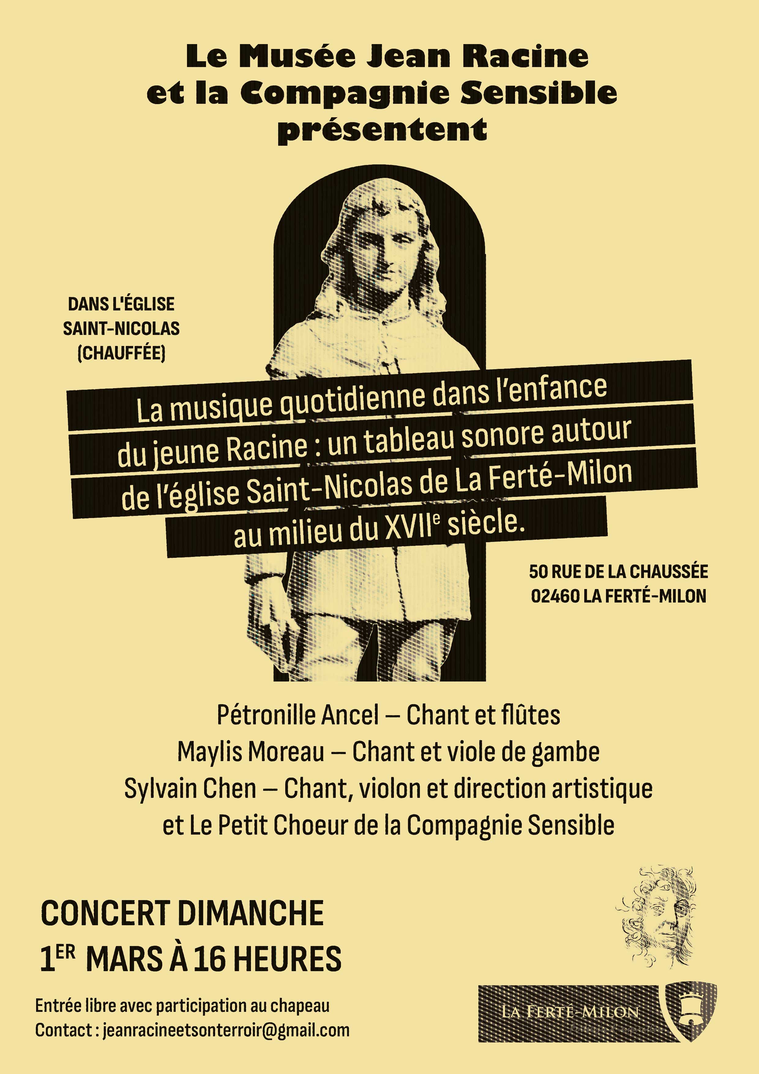 Le musée Jean Racine et la Compagnie Sensible présentent: la musique quotidienne dans l'enfance du jeune Racine; un tableau sonore autour de l'église Saint-Nicolas de la Ferté-Milon au milieu du XVIIème siècle. Entrée libre avec participation au chapeau. l'église sera chauffée.