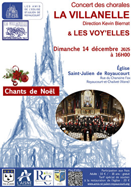 Rendez-vous le dimanche 14 décembre à 16h00, dans l’église St-Julien (Royaucourt-et-Chailvet), la célèbre chorale du Laonnois propose des chants traditionnels et des musiques de Noel. Les bénéfices seront consacrés à la restauration de l’église. Billets en vente en ligne (http://www.amis-st-julien-royaucourt.org ) et sur place. Tarifs: Adulte : 10€ -18 ans : gratuit Tarif spécial de soutien à la restauration de l'église : 20€. Le bénéfice de ce concert sera dédié à la restauration de l’église Informations au 06 22 70 89 33 ou par mail contact.amisstjulienroyaucourt@gmail.com