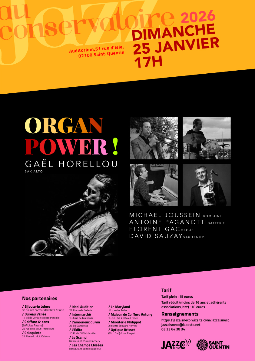 Quand cinq extrêmement actifs se réunissent pour l'amour du swing et du groove, c’est pour produire un jazz virevoltant et jubilatoire. Ces cinq-là ne comptent plus les collaborations tant ils sont présents sur la scène française depuis quelques années. Extension de l' Organ Trio de Gaël Horellou avec Florent Gac au Hammond B3 et Antoine Paganotti a la batterie, le projet « ORGAN POWER » donne à entendre deux solistes d'exception : Michael Joussein au trombone et David Sauzay au saxophone ténor. Sur des compositions et arrangements de Gaël Horellou, l'explosion des timbres est une véritable fête sonore.